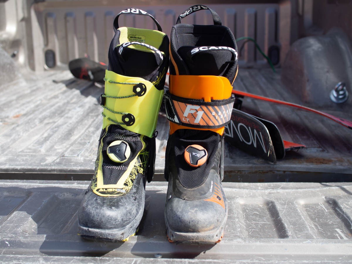 We really liked the efficiency of the now-discontinued Scarpa Alien RS. Scarpa replaced the Alien RS with the F1 LT. The lower shell is the same on both, and the overall weight is similar. The F1 LT skis at least a little better and fits a little wider. The biggest step backwards, though, is in ease and efficiency. To go from easy uphill mode to downhill mode with the Alien RS was accomplished with one rear-mounted lever. To execute the same transition with the F1 requires four steps. You tighten velcro power strap, tighten velcro main strap, snap the cuff lever and engage the rear-mounted ski/walk lever.