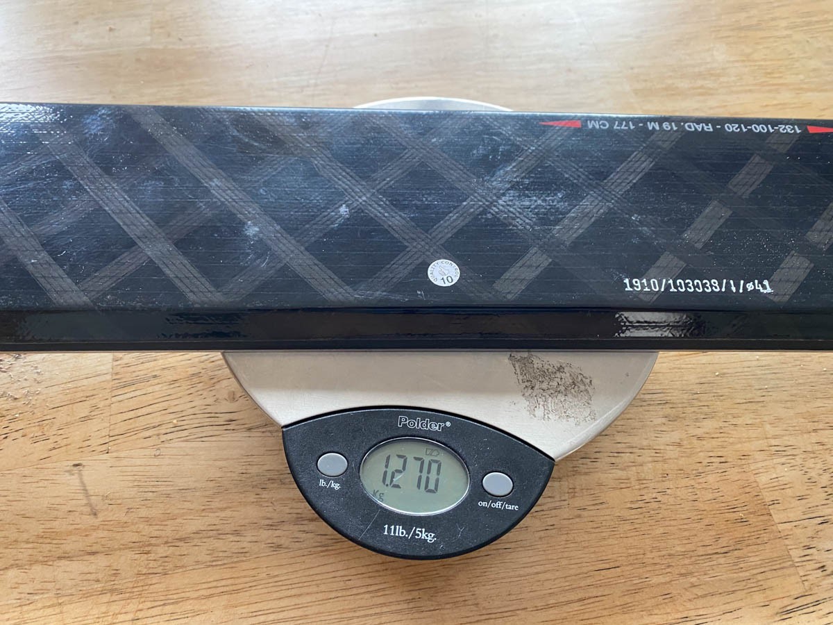 We report on the weight of all our tested skis in a variety of fashions. It is common convention now to refer to a ski's weight in terms of mass of one ski, in grams. The tested pair of Alp Tracks 100, on our calibrated scale, weighs 1270g and 1272g, respectively. Just two grams separating them is really, really good. That difference could be much greater for a different selection of the same exact make and model of ski. Manufacturing variations will always leave a range of possible weights for any particular size and type of ski.