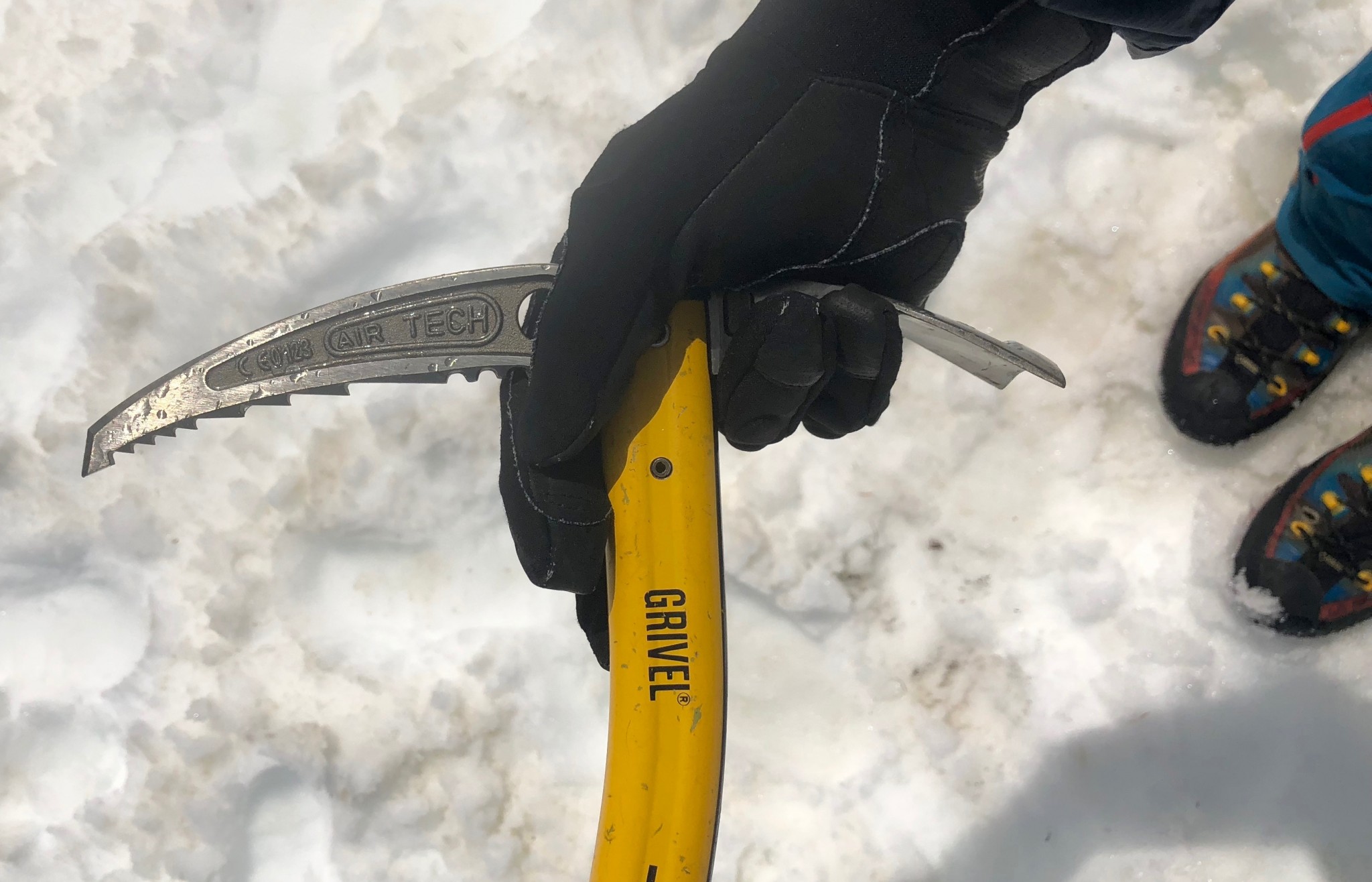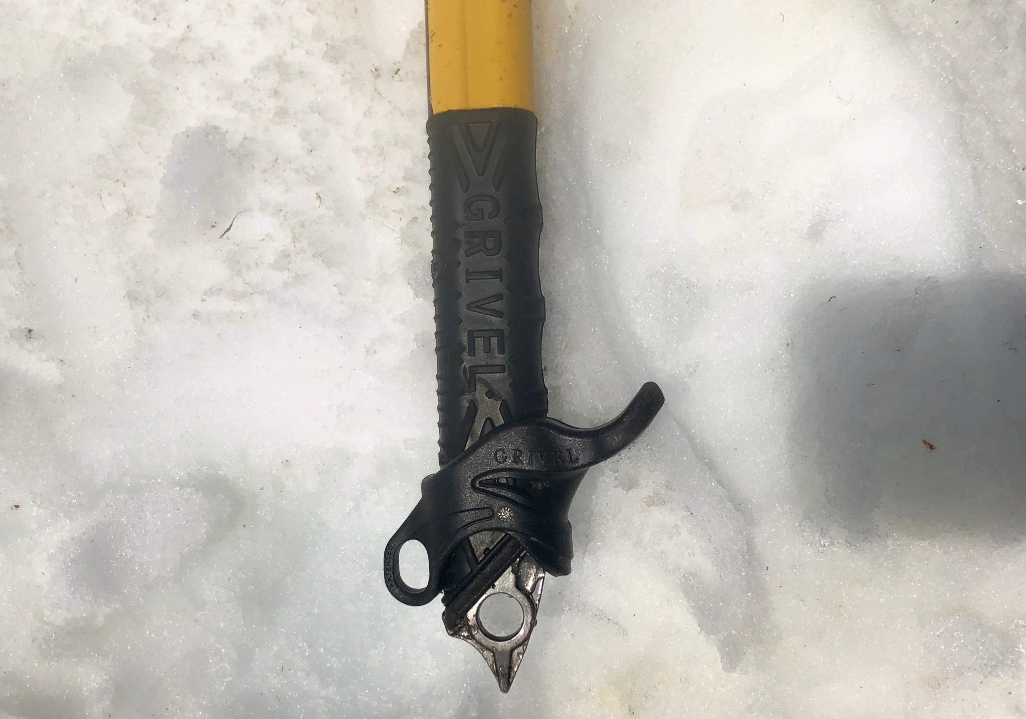 Our entire testing team also particularly liked the curved shaft for steep ascents because it was easier to maintain our balance by using the spoke of the Air Tech Evo. All of our testers agreed that the curved shaft was nice for steep ascents while still holding the axe in the self-belay/piolet-canne position (not yet with the pick in the snow).