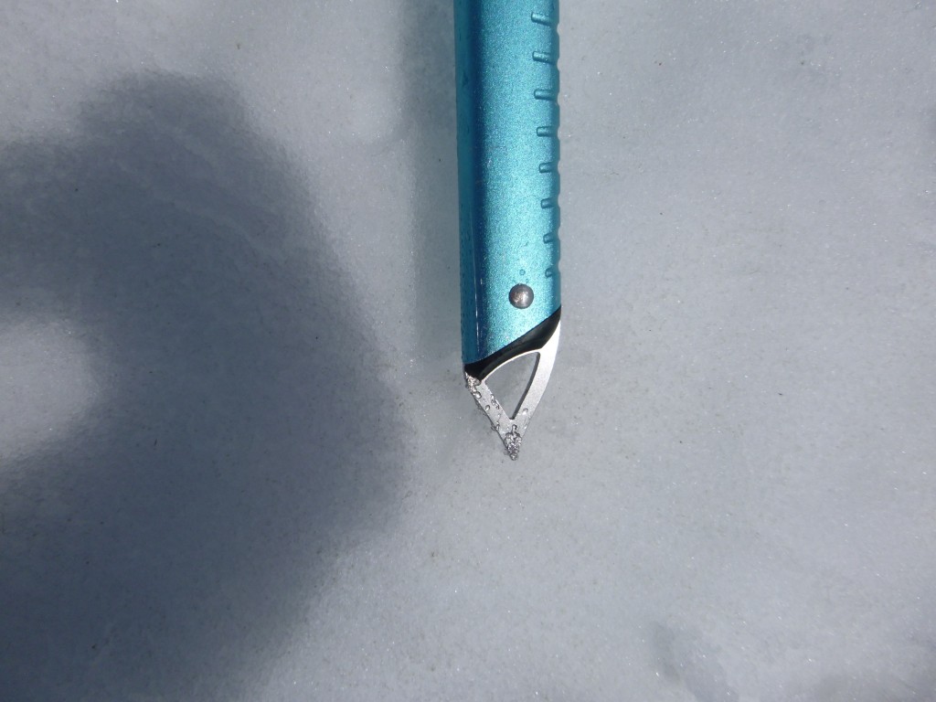 It features a pick that effectively penetrated even the firmest of snow whether swinging, in mid-dagger or low dagger better than nearly all of the other sub one hundred dollar models, like the Black Diamond Raven and Raven Ultra. The ripples on the lower part of the shaft also provide additional grip while swinging the axe.