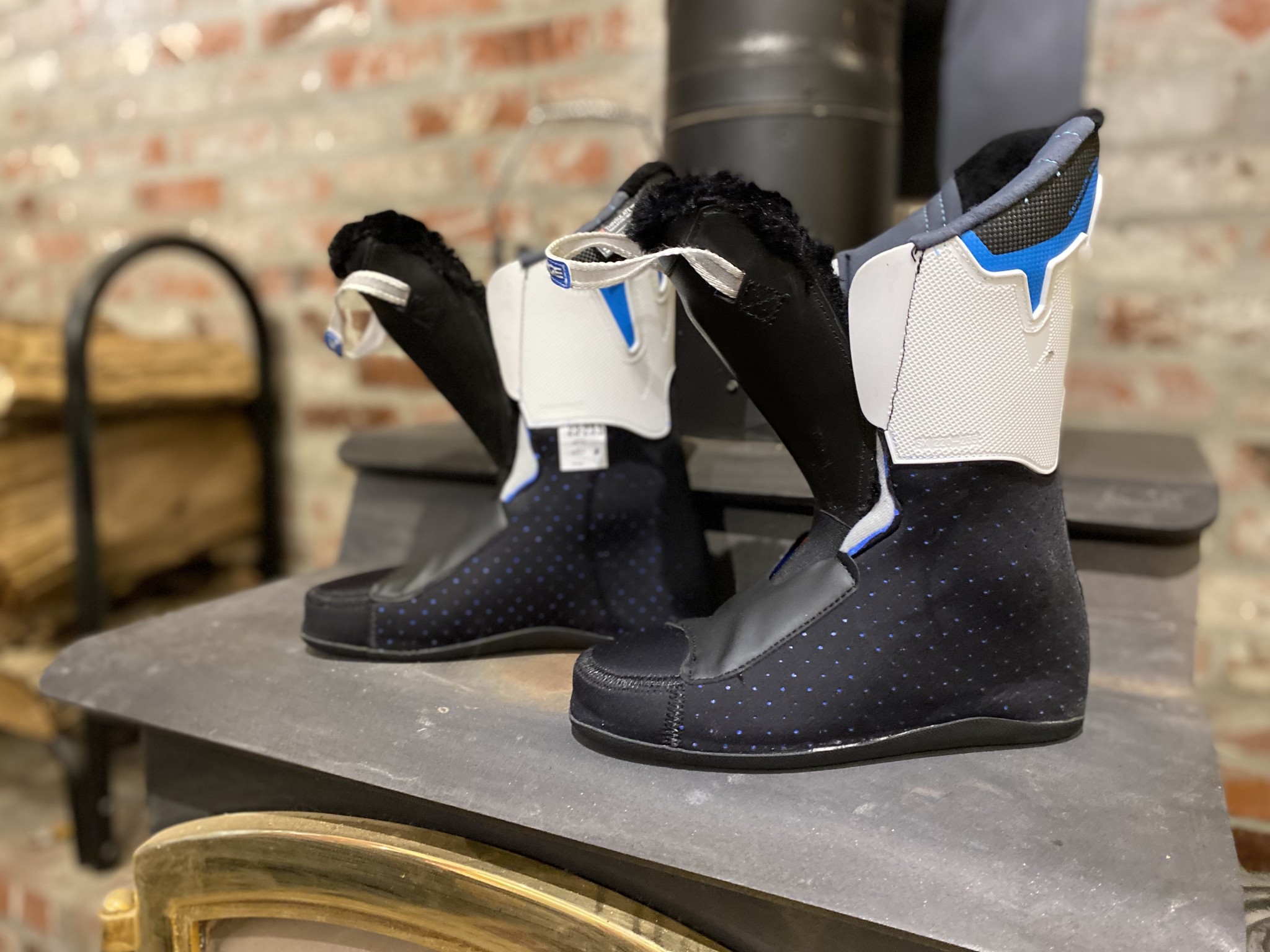 Warming up the fuzzy Lange liners before heading out on the hill. The plastic white backing around the mid shin and calf area felt very stable and supportive. Credit: Liz Chamberlain