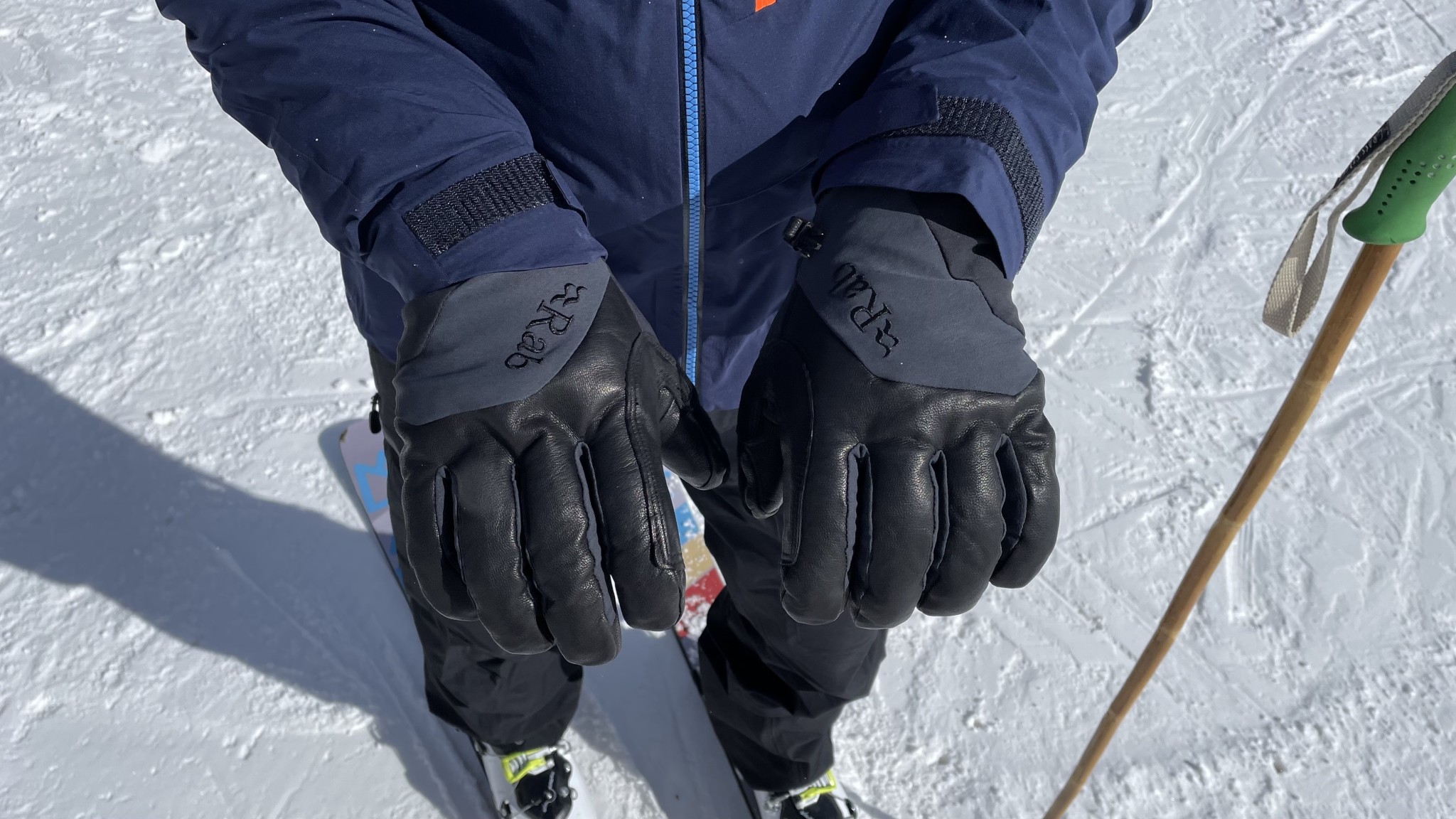 The Rab Khroma Freeride has enough features to keep most users satisfied. The wrist gauntlet is wide enough to fit over a hardshell jacket cuff, but it also sinches tight enough to fit inside most winter jackets. A removable wrist leash helps avoid dropping the gloves off the chairlift, and there is also a clip to keep the gloves together during storage and travel. There is a soft and generous nose wipe on the outside of the thumbs. Finally, the leather on the fingertips is touchscreen compatible after being broken in.
