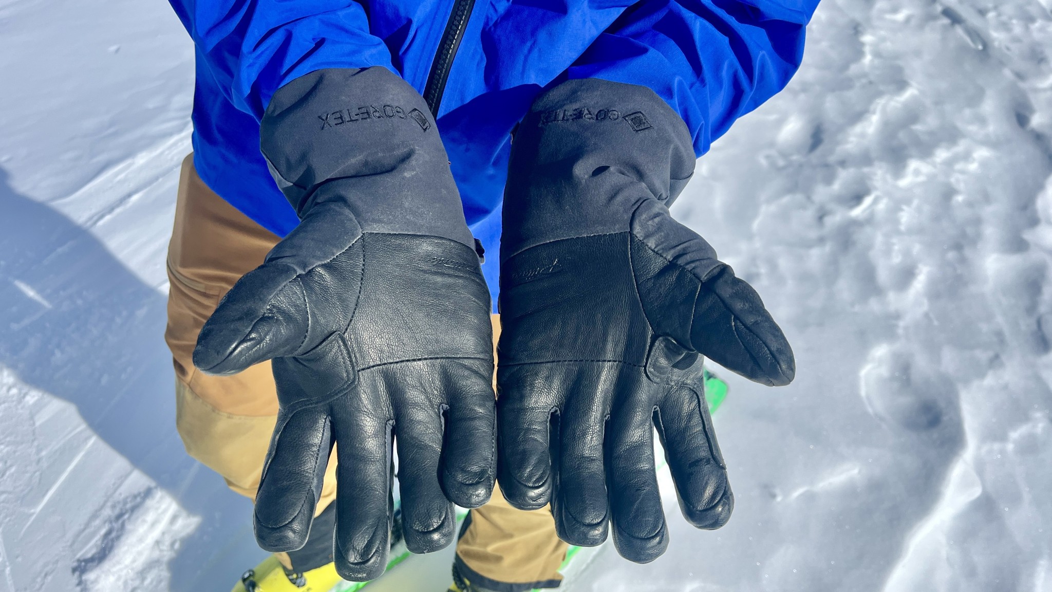 These gloves are tightly sealed against the environment. They feature burly leather and softshell around the outside of the glove, a DWR treatment, and a Gore-Tex insert to keep water at bay. The wrist gauntlet reaches high up the user's forearm and has a drawstring that securely tightens over a jacket cuff to keep snow out of the glove on powder days.