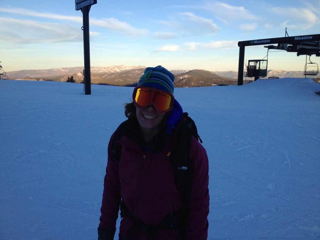 Katie finishing the day strong with the Dragon DX goggles in fading light. Credit: Aaron Zanto
