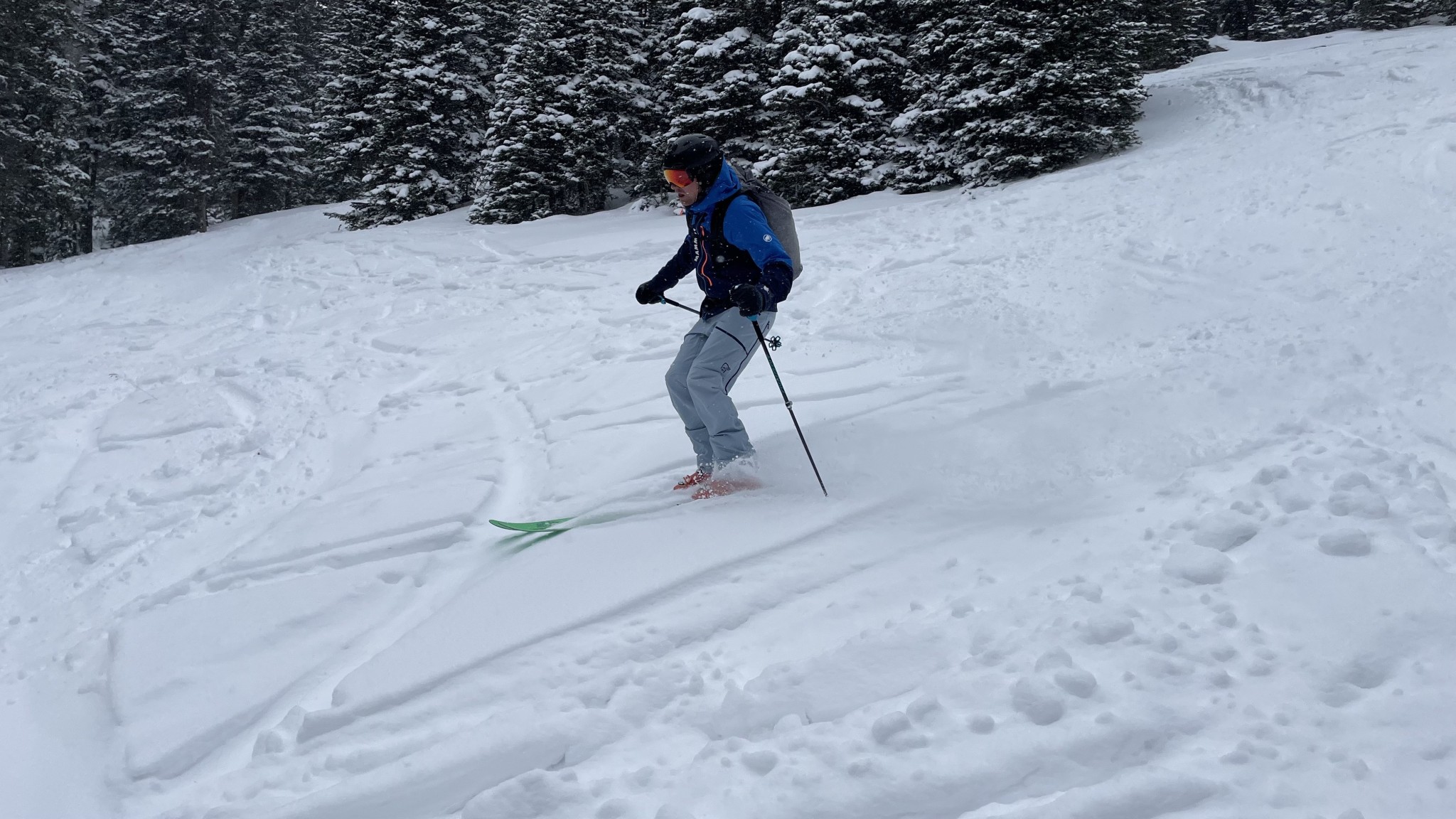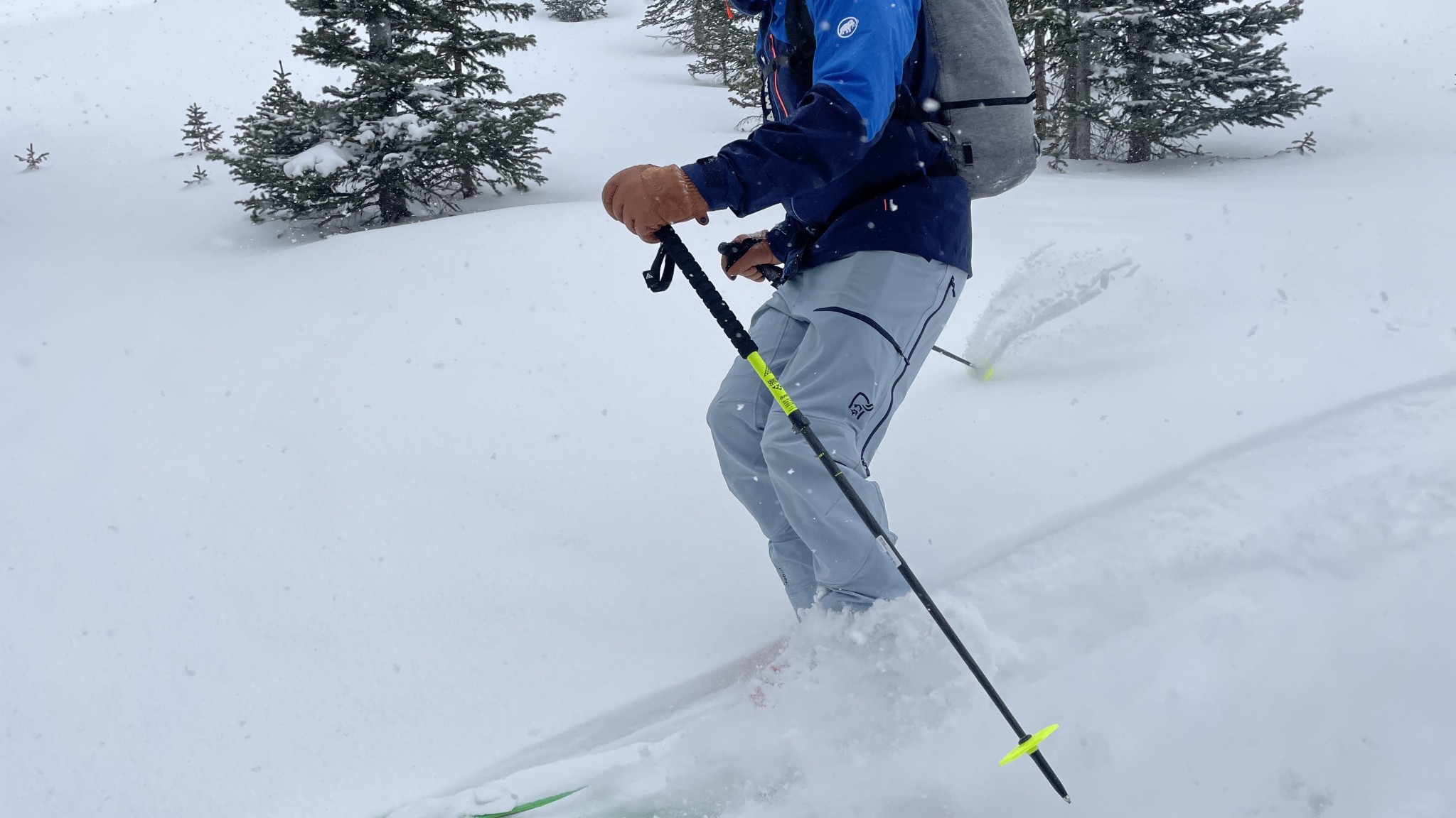 First off, the Lyngen Flex1 don't provide as much weather resistance as most other ski pants on the market. Their fabric isn't waterproof, so if lots of liquid water is present, these pants will not keep you dry. However, they will repel dry snow, and we found them plenty protective for backcountry ski tours in light flurries. They're also treated with a DWR coating, meaning they will repel some liquid water until the DWR washes or rubs off. If the snow is really coming down, or if we expect to be skiing through deep powder, these pants don't have enough weather protection.