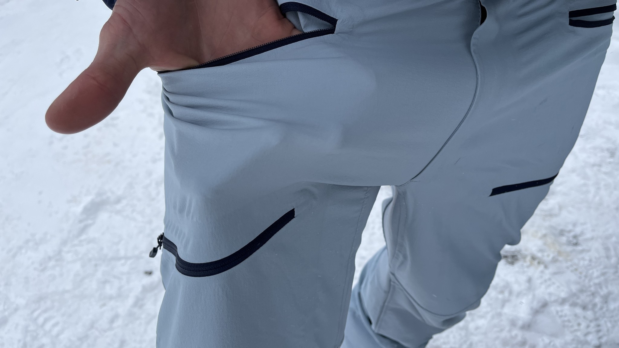 The Lyngen Flex1 has good features that make life in the backcountry a breeze. With four pockets, there is plenty of room for a transceiver, phone, lip balm, ski strap, neck gaiter, and other small accessories. The right thigh pocket has a sleeve for an avalanche transceiver, which keeps the device upright and positioned comfortably along the outside of the thigh. There are elastic gaiters that fit easily but securely over ski boots, and the gaiters even have nylon straps that can tighten the fit even more, preventing snow from getting into the pants. The shells don't have a zipper to adjust the circumference of the cuff around the boot, but there are buttons that can make the pant shell fit tighter at the cuff.
