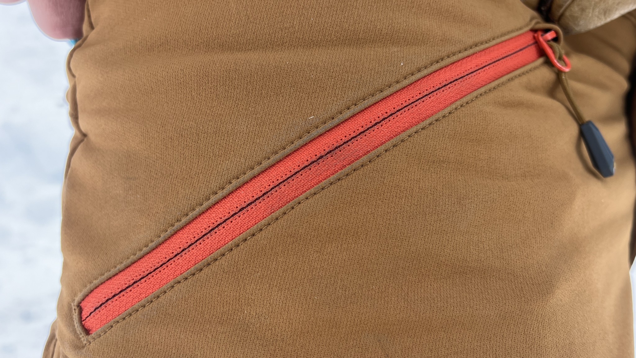 These pants have an excellent set of features. There are two waist pockets for holding small items, and they are placed in a way that doesn't interfere with the hip flexors when skinning. The right waist pocket has a sleeve and clip for an avalanche transceiver. The two thigh pockets are also placed wisely, with diagonal zippers that are easily accessible from above. There's even a rear pocket on the right buttock, but we don't use this pocket often.