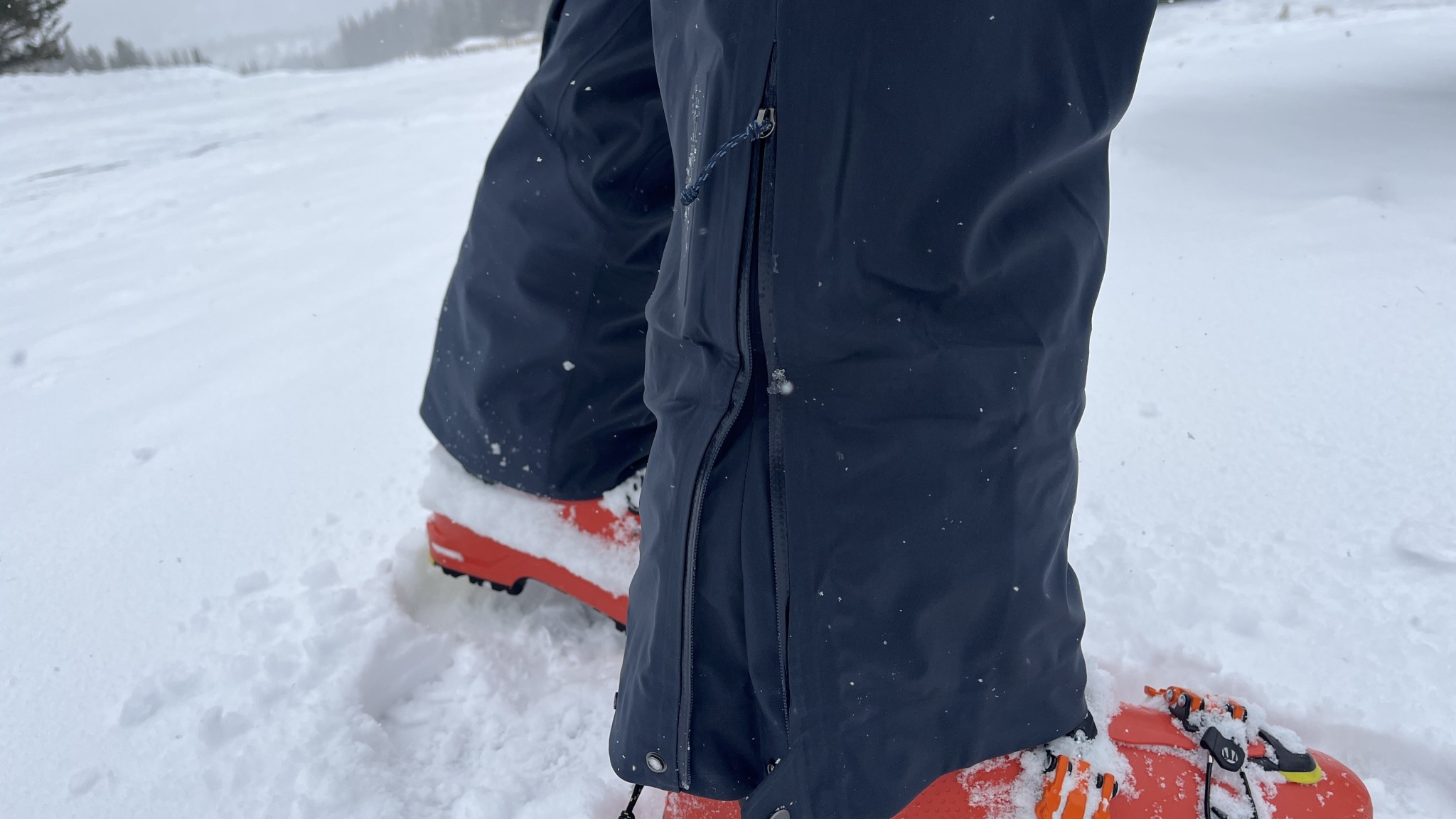 The cuff has a zipper that opens to allow two more inches of circumference, which we used to fit around our boots when unbuckled for uphill travel. At the top of the run, when we buckled our boots, we could zip the cuff down to its normal circumference. There's even a button that allows for another inch smaller diameter, which can seal the pants tightly so that powder doesn't make its way up into the boots during long bootpacks through deep snow.