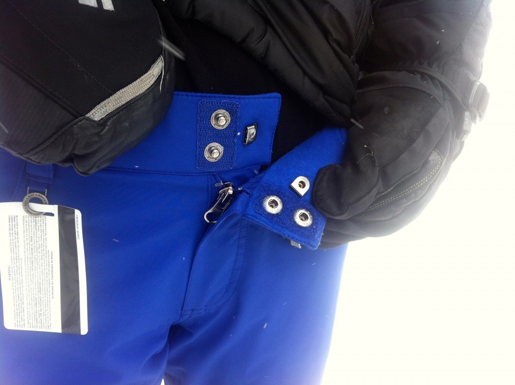 A pass holder ring, zippered front pockets, and boot hooks on the gaiters are features that set this product apart from the others. Unfortunately, the tight entrance to the hand pockets makes them extremely hard to get into. This piece is also fitted with a fleece lined waistband, back pockets, mesh lined venting, boot gaiters, and an adjustable waist band. The wide leg fits nicely over snowboard boots and they have simple jacket attachments. This system is similar to the jacket loops on the Patagonia Snowbelle and The North Face Freedom; meanwhile, the Marmot Freerider pant has a full zip powder skirt, which provides extra warmth and weather protection.