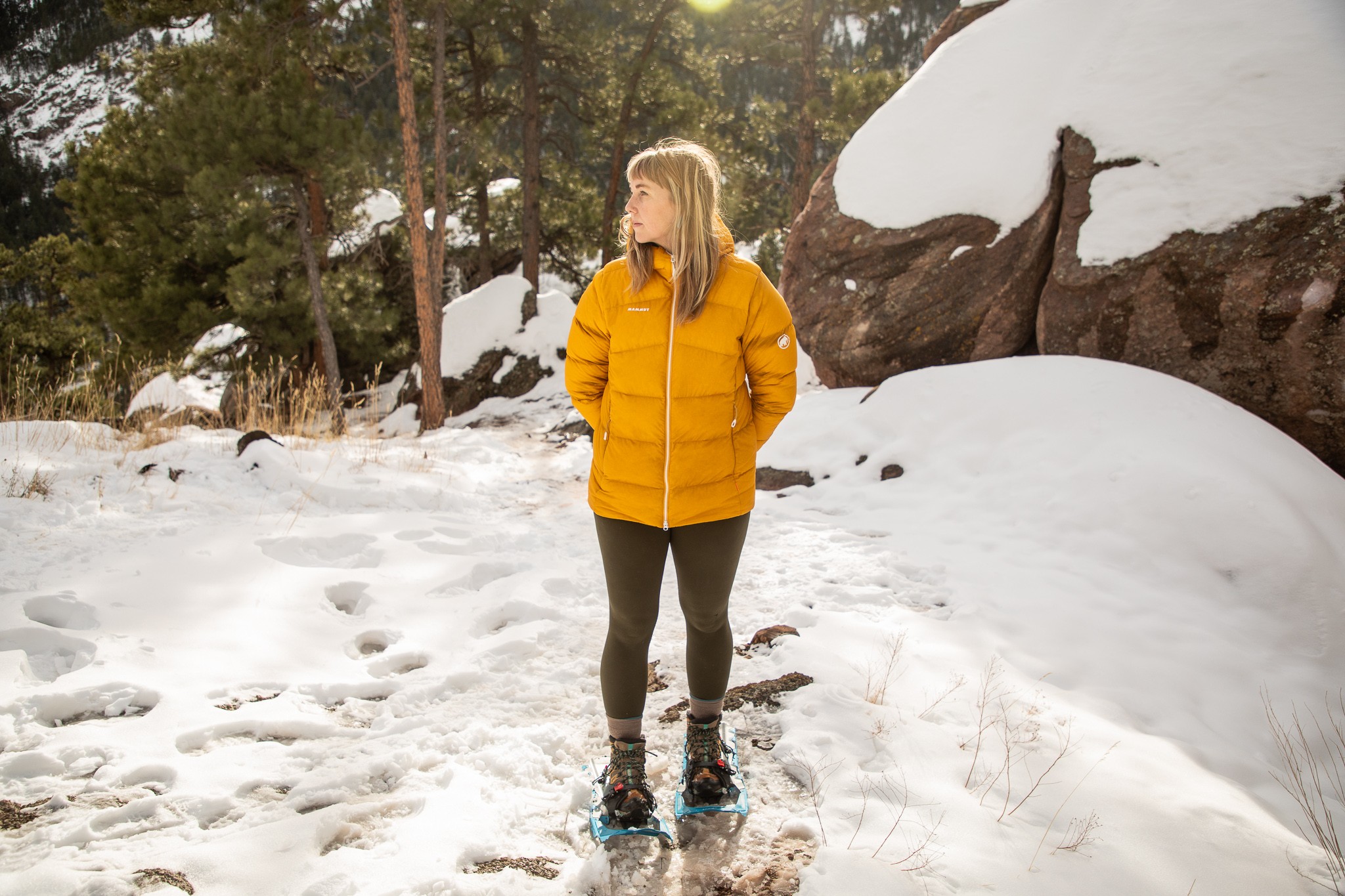 Most people have to adjust their gait a little to accommodate snowshoes because they are significantly large than their feet. While larger shoes offer better flotation, smaller or curvier shoes help encourage a more natural stride. The Revo Explore is a thin snowshoe with little to no curvature, and most of our testers found it allowed a natural stride. The walkability was most impacted by the bindings which could pinch during the hike, especially on downhills. The Erg Televator heel lifts help reduce fatigue on steeper terrain and are easy to deploy. Our major issue with the Revo Explore is how loud the decking is. If you are not sensitive to white noise, this probably won't bother you, but we found it hard to hold a conversation or enjoy the sounds of nature while hiking in these snowshoes.