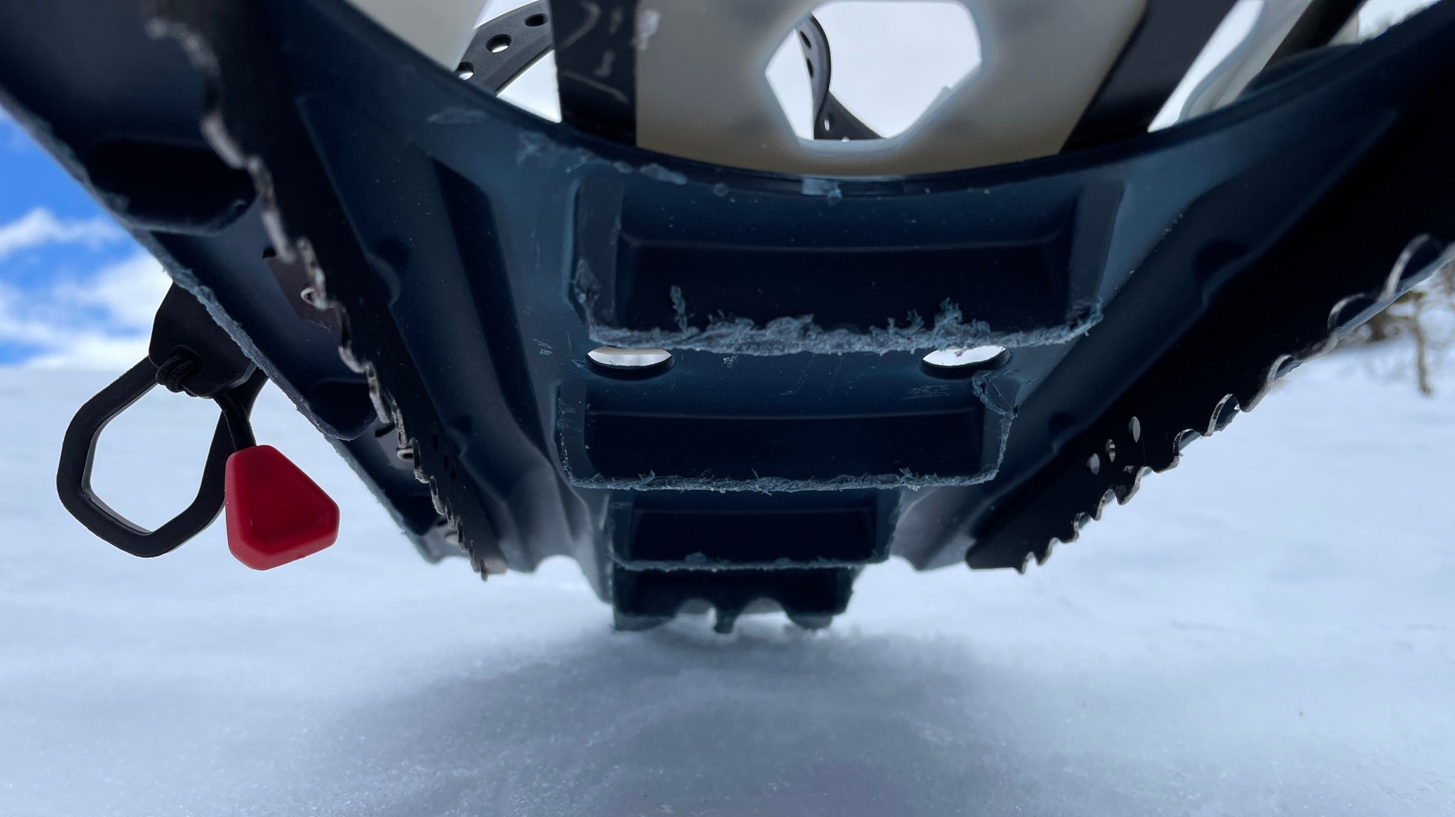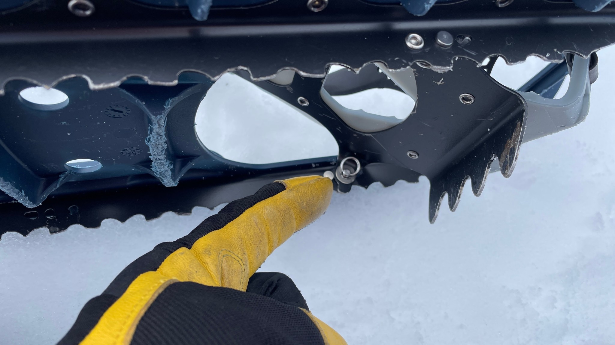 The crampons are on a full rotation-pivot binding for an unencumbered range of motion. Three brake bars are designed into the plastic deck and perform well on moderate rolling terrain, resisting slipping on the way up and especially on the way down. The underfoot crampon teeth and lateral crampons are made from powder-coated steel. The underfoot crampons dig into hard-packed snow for security through each stride, while the lateral crampons are best for side-stepping and provide some uphill and downhill traction as well. Additionally, our testers found that the rigid deck was great for cutting into the snow while side-hilling. One tester commented, “The rigidity lets me use the uphill edge of the deck to create a level platform to stand on, which is really nice when I am breaking trail for a group.”