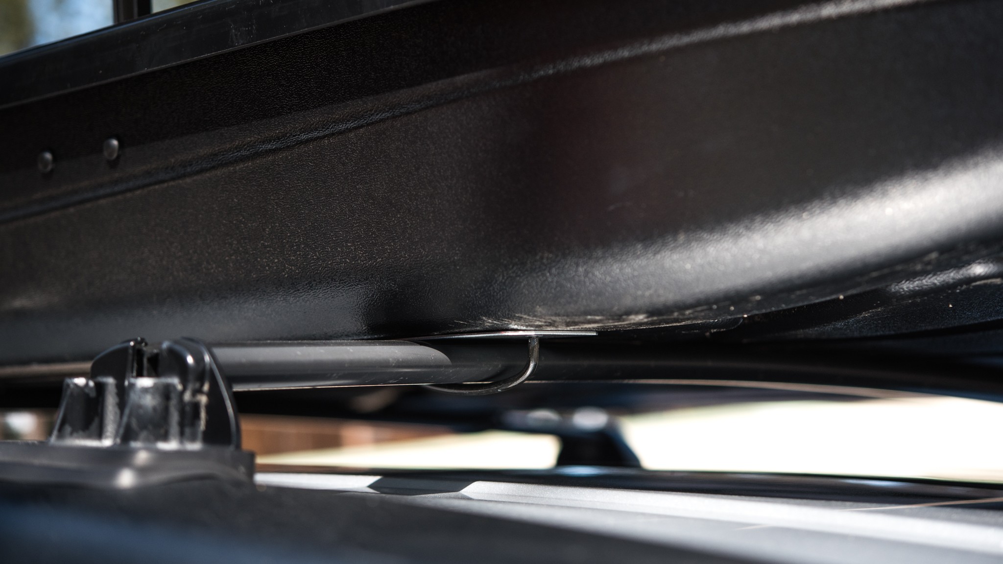 Compared to the seamless design of other models, we would be cautious about putting our electronics in the Vista XL unprotected. For the U-bolt system to be universal, there are multiple sets of holes to choose from depending on your crossbar width. Because of this, you're left with holes in the bottom of the box. SportRack's solution is to provide some vinyl stickers to cover the holes. While this helps, they are pretty easy to pull off. The Vista X* should keep your things dry in a normal rainstorm — these holes are tiny, mind you — but we would recommend putting your moisture-sensitive belongings in a drybag before going in the box. Despite the box's flimsiness, the wind didn't seem to affect it, and we never heard any rocking or whistling, no matter how fast we were driving.