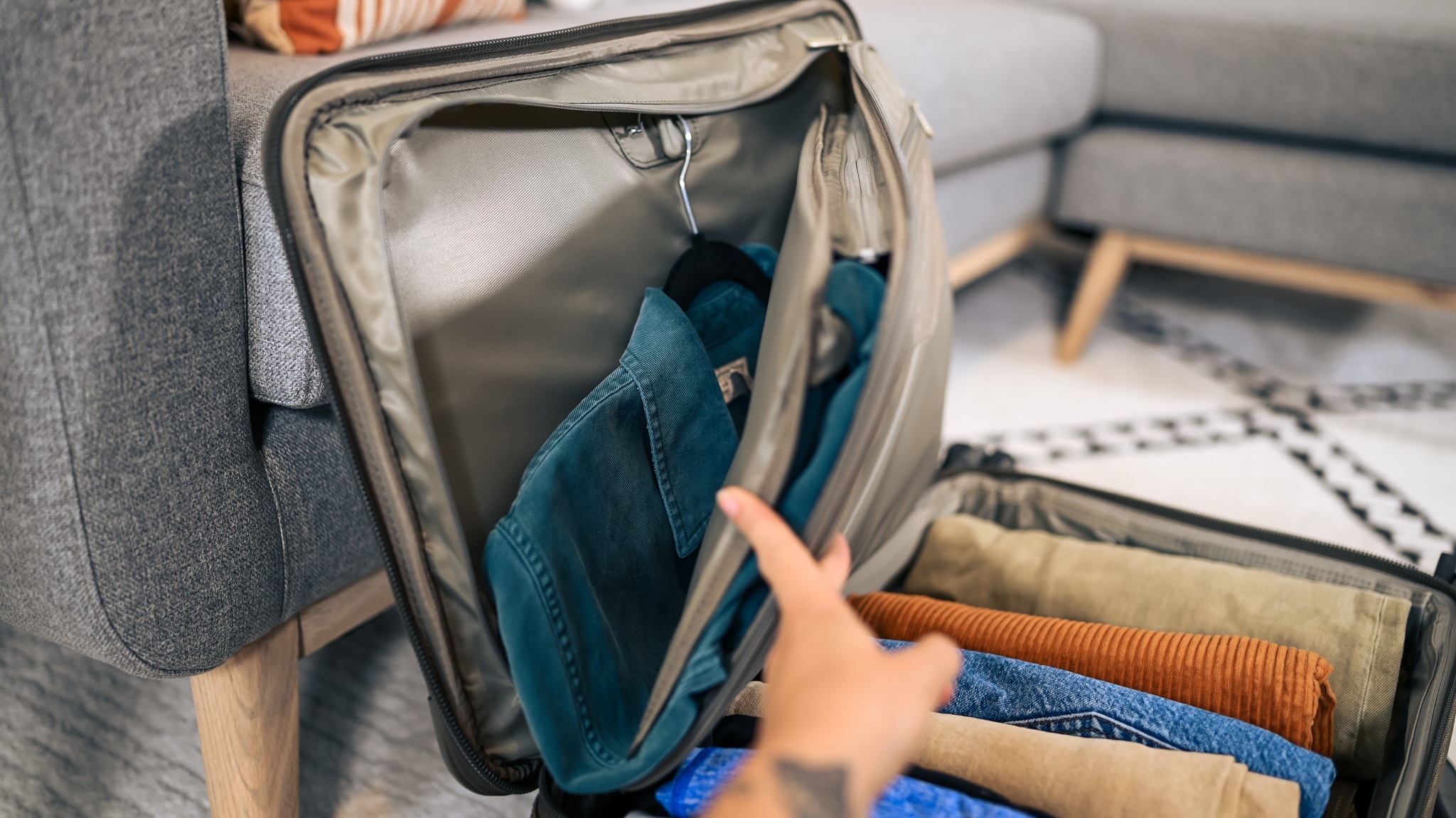 The Baseline Essential also boasts some of the best zippers from the test group, with pulls that glide like butter around the edges of the bag, even at full capacity. Not once did I have to fight with them nor worry they'd get caught up on closure or give out when the bag became overstuffed. Meanwhile, each of the three exterior pockets is well thought-out in terms of placement and size, which allowed me to organize and access all day-of incidentals easily while on the move. The large front sleeve pocket stowed a 17-inch laptop with no problem. But, if you'd rather keep your computer stowed under the seat in front of you, a laptop backpack may be a nice accessory. Lastly, I loved the Baseline Essential's brightly-lined top pocket that was perfect for tossing in our phone, tickets, or keys. Its inconspicuous power pocket is nested on the backside within the external telescoping handle mount. It was a perfect spot to stash a power charger and cords, so they were easy to grab for a boost while I was on the move.
