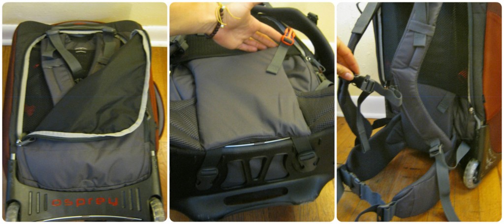 In addition to four internal organizer pockets, the Osprey Meridian has two external pockets: one that is accessible from just below the top carry handle, and a slim drop-in pocket on the zip up flap that protects the backpack straps (note that you cannot use this pocket if you are in backpack mode). This piece also has built-in piggy back straps to connect other bags and useful internal compression straps. Its most important feature, however is its detachable daypack. If you are looking for a bag with a detachable daypack, this piece is certainly a good option. The daypack zips on and then securely clips into place with three big plastic buckles. When you want to travel without the daypack (or remove it), the main bag looks like a normal carry on.