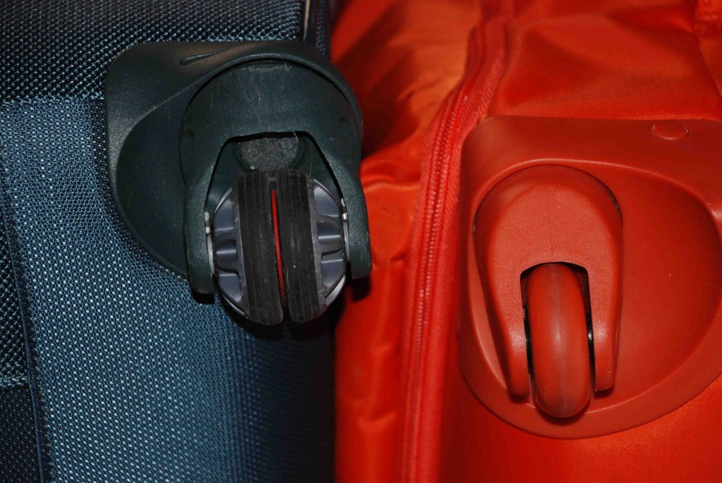In addition to the telescoping carrying handle, there are three additional handles (top, bottom, and one side) on the Sphere so that you can easily remove this bag from overhead storage or the trunk of a car, or in case you need to carry it on a flight of stairs. Samsonite uses a unique construction detail on these handles. Instead of sewing or tacking them onto the bag, they are cut from the main body of the bag itself. For these handles to rip off (a common complaint with luggage), the whole body of the suitcase would have to tear.