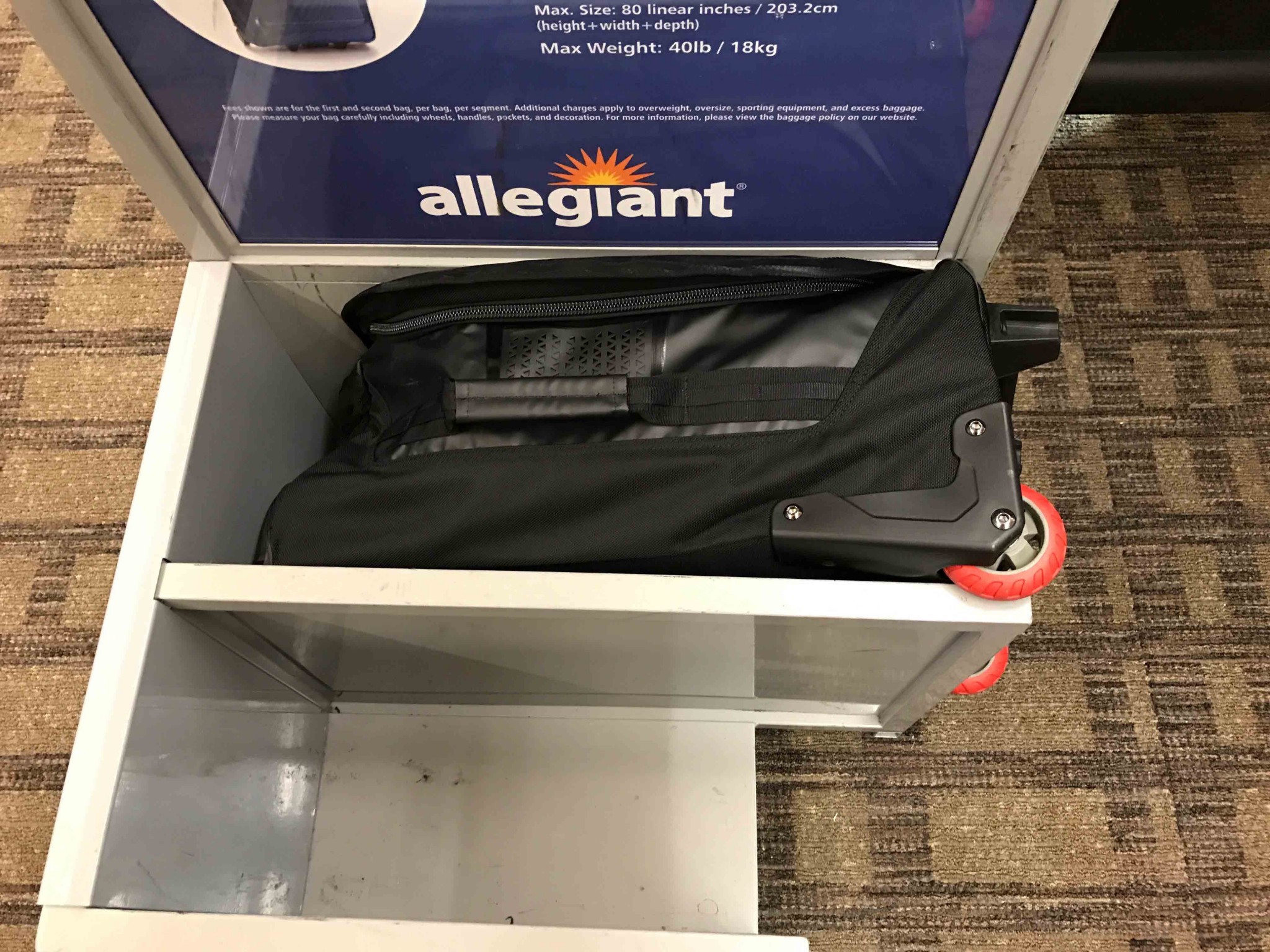 There is a sunglasses/phone pocket at the top of the bag, and an add-a-bag hook which is also a nice touch. The bottom frame does help the bag stay upright, and it's not too front-heavy, but it did tip over on us a few times. Our testers have mixed feelings on the style of this bag. It comes in a variety of prints and also a high-gloss black, which is the model we tested. The black bag looks cool at first, with a red interior and some contrasting red on the handle and wheels; however, after only one use the red wheels became “dirty” red in color, and no longer looked so attractive. There is a reason why every other bag that we tested had black wheels, and we don't think we'd purposefully purchase a colored wheel again. This bag also has a technical/casual look to it — it is just a rolling duffel and is better suited to weekend travel and camping trips than business travel.