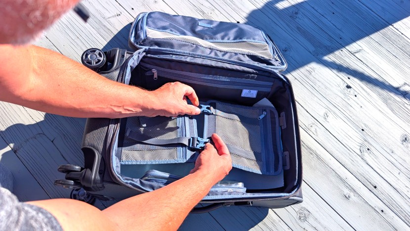 We hand-measured and calculated the total storage volume of this bag's main compartment at 40 liters. While traveling with our Platinum Elite, we fell in love with its internal tie-down system. It allowed us to buckle in and secure any payload, keeping it in place. This reduces wrinkles and damage, and it keeps the bag stable and balanced when being rolled or lifted.