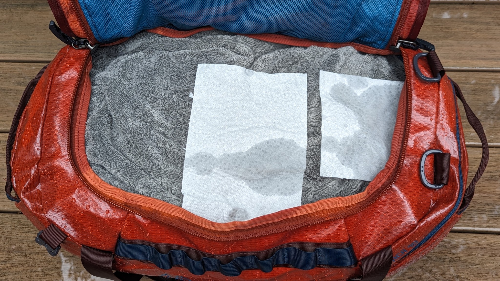 In both our real-world experiences and our side-by-side high-pressure hose tests, the Alpaca performed well time and time again. The TPU laminate coating does a great job of repelling water from the bag's surface, and the top lid has a generous weather flap that does an excellent job of protecting the main D-shaped zipper from the elements. Water beaded right off the bag when we exposed it to a one-hour rain bath in a tropical storm. During the host test, water did seep in through the seams, but significantly less than in other models. Both of these features help keep your contents dry in most normal travel conditions, aside from extended heavy downpours or full underwater submersion.