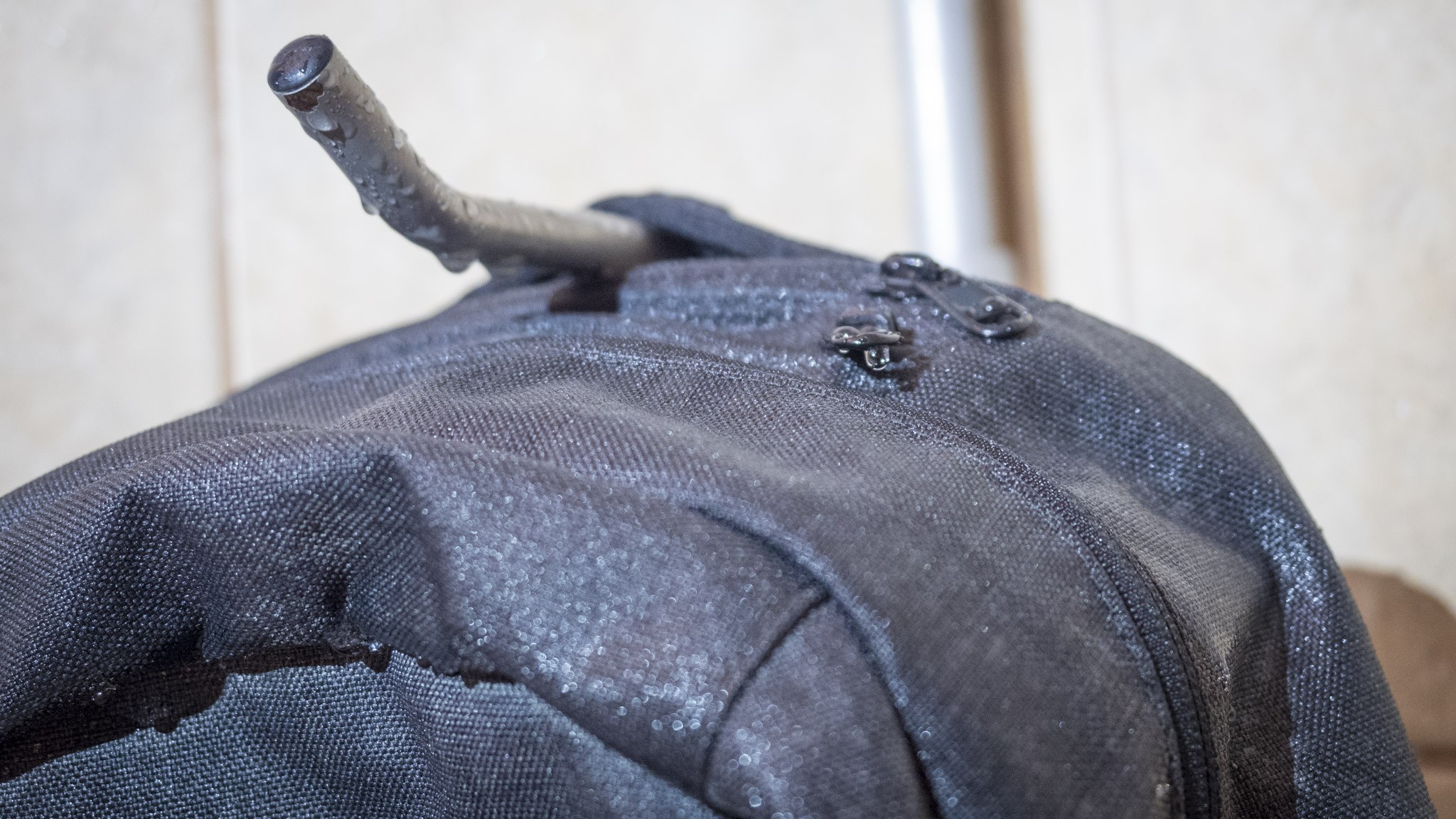 The Explorer is one of the worst performers in our water resistance “shower test.” When holding it in a shower, the water absorbed into the fabric. We noticed it does not have a DWR coating or fabric flaps covering the many exposed zippers. In this test, water pooled at the bottom of the bag. If you expect to get wet a lot, then this is not a great choice for you.