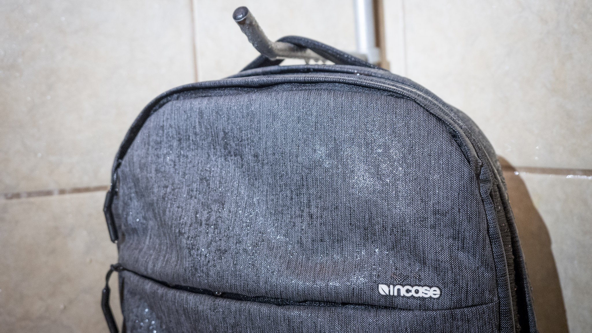 This pack is not water-resistant. It became almost fully saturated within seconds of a simulated downpour. It leaked, especially in areas where the zippers met the backpack.