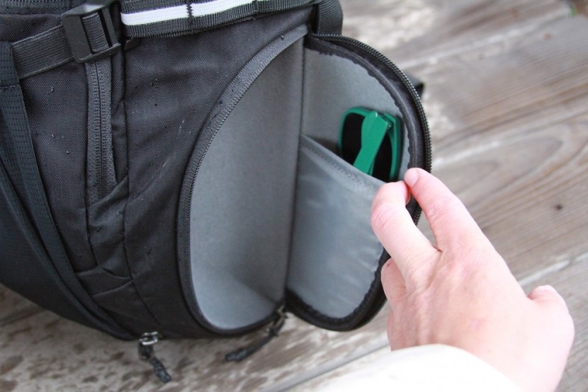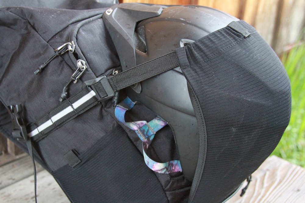 We also appreciate the built-in helmet cover that keeps a helmet strapped onto the backpack when you're at work. This detail functioned just fine, clipping into the clip-in points located laterally to the smaller compartments at the front of the back. We also appreciate the stowable rain cover. We found that if you didn't think you needed the rain cover, you could remove it, and its stash spot becomes a pretty voluminous “hidden” pocket: awesome features, awesome storage, awesome backpack.