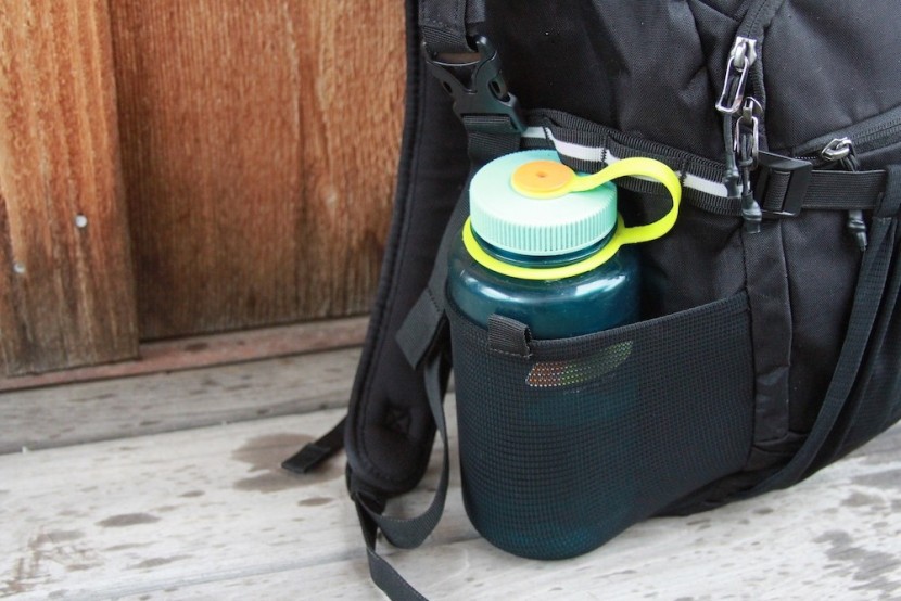 There is also a tiny pocket on the front of the smaller compartment. It has excellent volume and is where we store our wallet and phone for easy access. The water bottle holder on the side has an expandable mesh pocket that functions even when the pack is fully loaded. It's perfect for an on-the-go coffee cup or 1L Nalgene bottle.