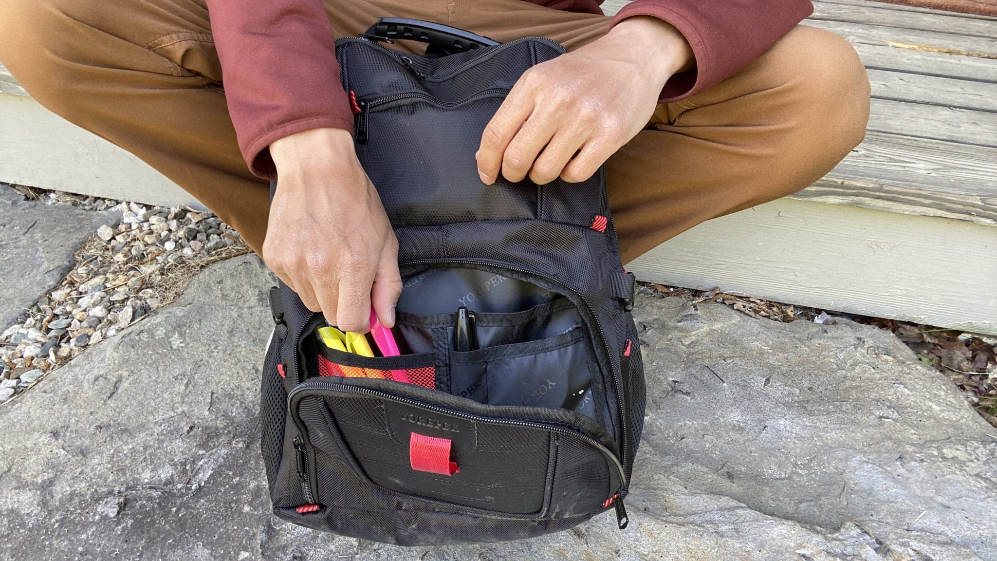 For multi-day travel, we were able to stuff this pocket with five days' worth of clothing, a pair of dress shoes, and our toiletries. The third large compartment is perfect for larger accessories like noise-canceling headphones. There are also four smaller pockets — two on the front that can hold earbuds, pens, and other office supplies, and two on the sides for an umbrella or skinny water bottle — plus two more mesh water bottle pockets on each side. Our only concern about the Yorepek's storage is that it might be too much for most typical days. We were often tempted to carry extra items we wouldn't typically take just to fill up all that empty space.