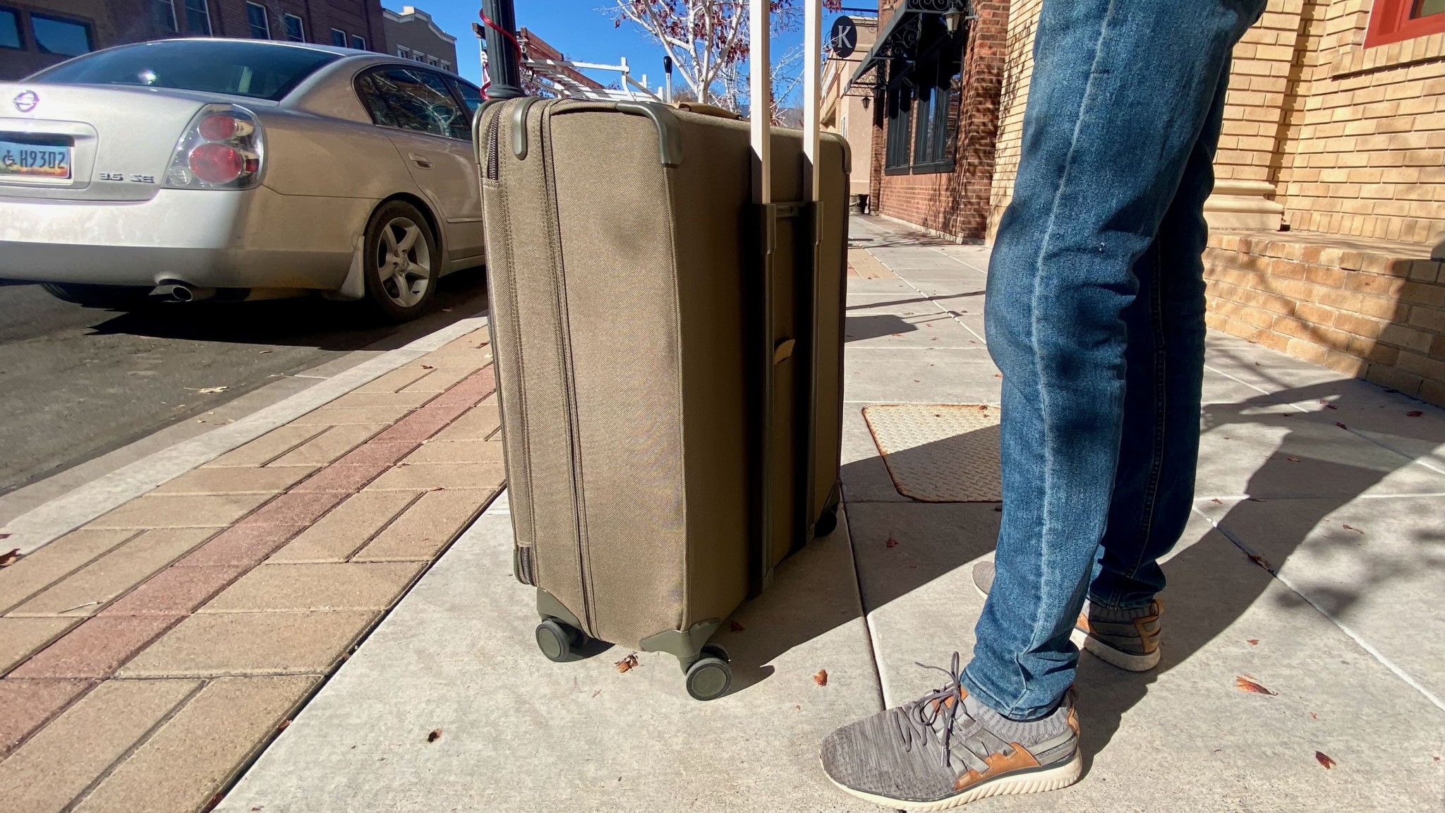 The Baseline Spinner suitcase has larger wheels with a proprietary shock-absorbing design, making for smoother rolling. Four settings on the telescoping handle (up from three in the last version) make it easier to find a comfortable height for your body. Double-swivel wheels pivot and twirl with minimal input on the handle. The internal restraint and compression systems we like so much also help keep everything centered over the wheels. This eliminates the front-heavy bulge that happens with some expandable suitcases and ensures the bag never topples over due to an imbalance.