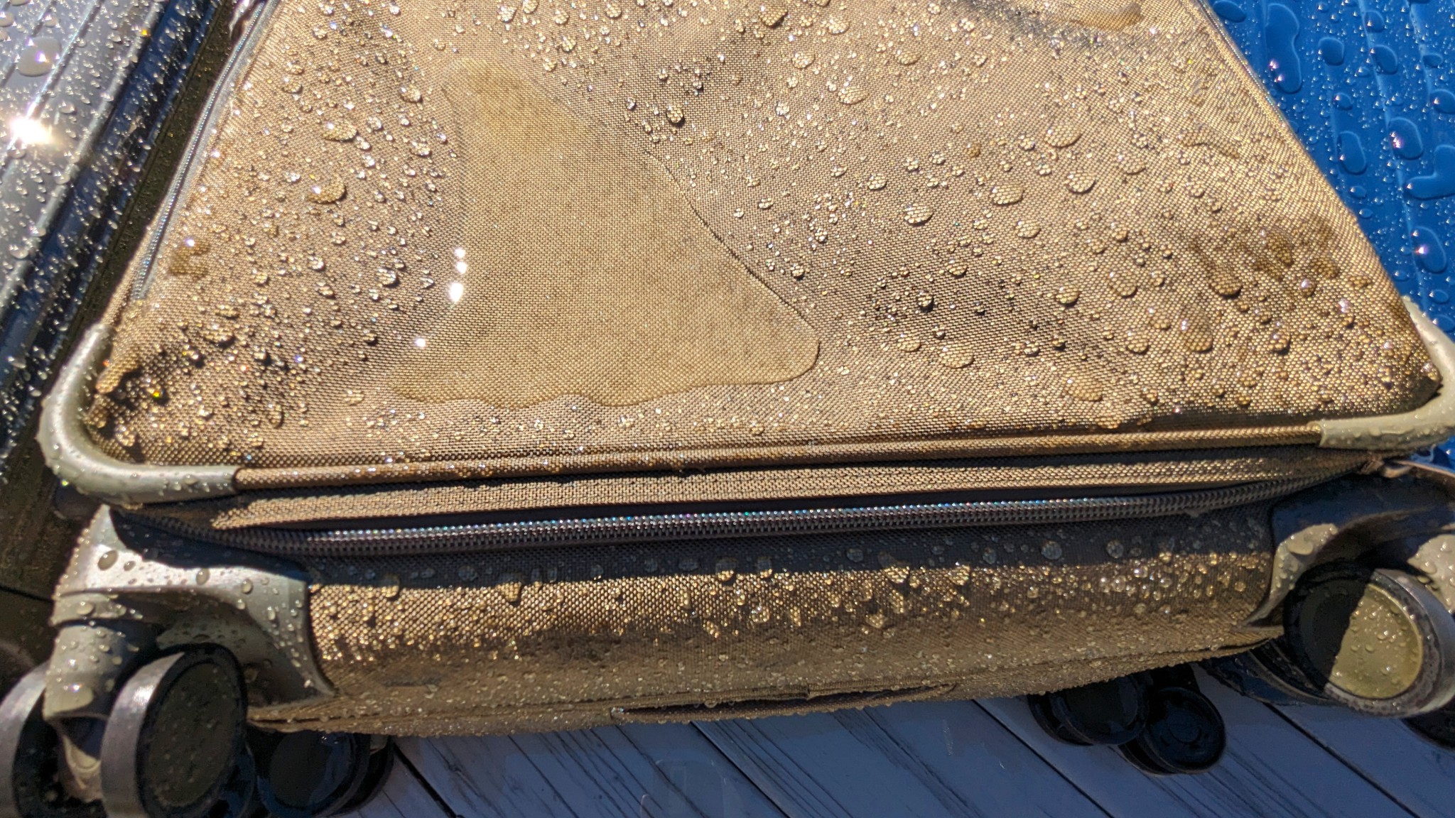 The exterior pockets were mildly damp on the inside, while the paper towel in the main compartment was completely dry. However, upon closure inspection, there were signs of moisture seeping in along the walls. Although only slightly damp, this seepage was quite prominent and widespread. We also subjected the case to an amount of water comparable to walking for 10 minutes in a torrential downpour. So, while not perfectly water-resistant, the Baseline Spinner does an excellent job of keeping rain or spills from reaching your valuables.