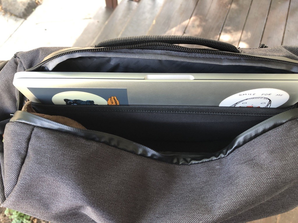 The Vale fits up to a 13" laptop, though it's a bit snug — a smaller computer or tablet slides in much more easily. Either way, the front of the dedicated sleeve is nicely stretchy, and once packed away, everything is quite secure. The back of the bag is generously padded for both comfort and additional protection.