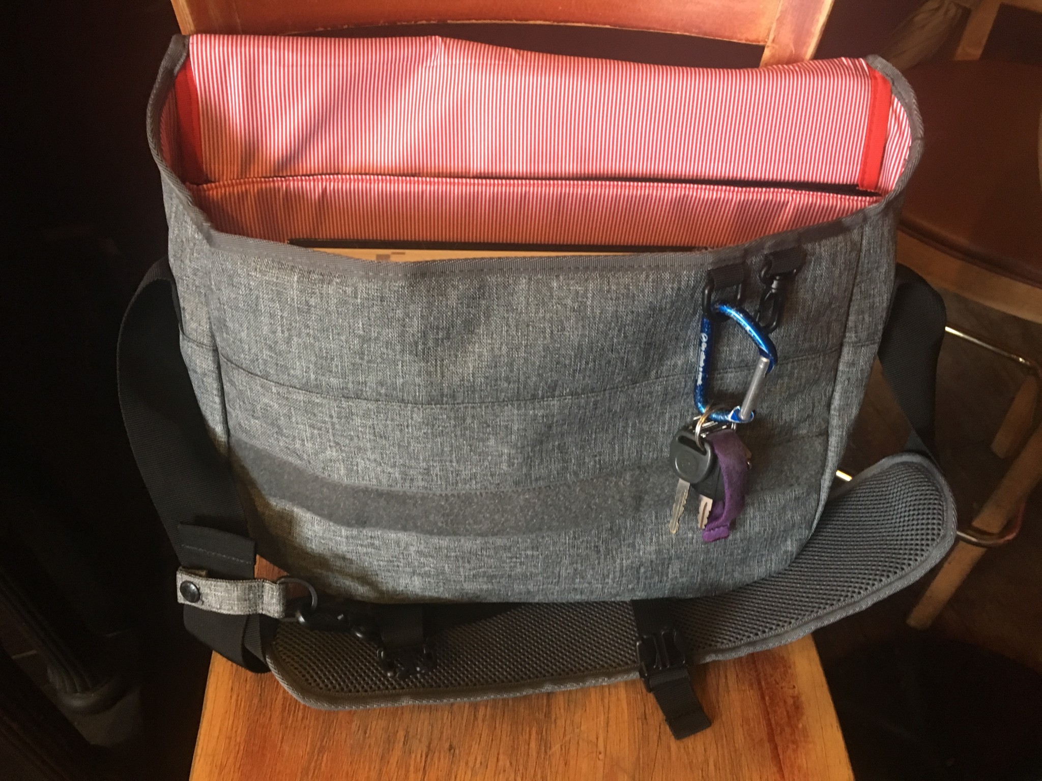 Those pesky internal mesh pockets are also centered and too small, making them easy to overstuff, which then makes them bulge, decreasing the carrying style at best and comfort at worst. The external flap buckles don't adjust very much, only about 3-4 inches, making it hard to close with minimal overstuffing. That strap also unthreads easily, almost falling off on a few occasions. The bag has a handy clip and loop for keys, giving you two options for clipping items under the outer flap. You can use the bag's clip if you have a regular keychain, or if your keys are on a keychain carabiner, you can just clip that to the plastic loop.