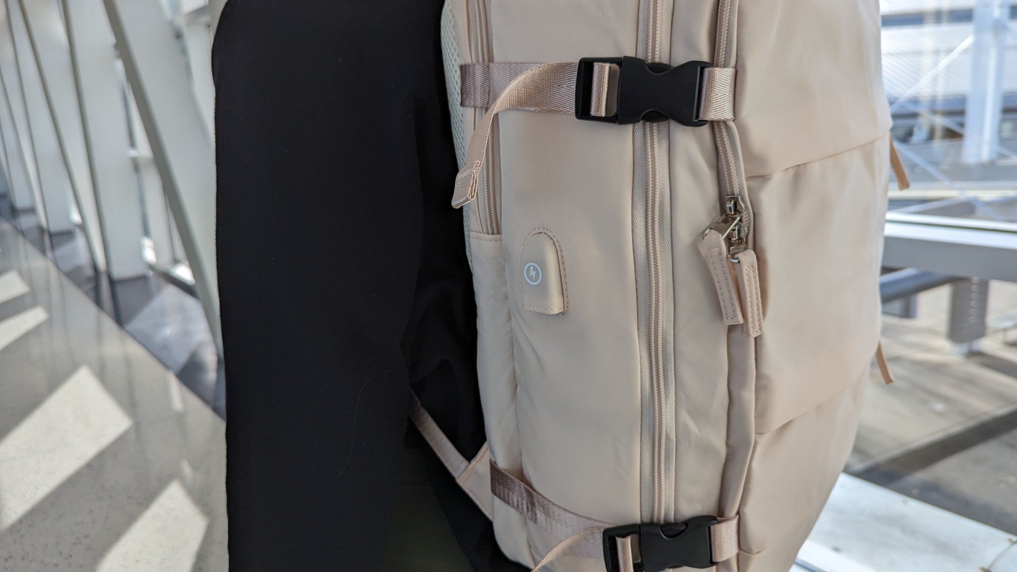 Unlike many other bags in our lineup, the straps on the Coowoz are permanently affixed to the exterior. If you're not using the backpack straps, they can be cinched tight but not stowed away in a discreet pocket. There is a decent grab handle, but it is located on the top of the bag only. A convenient ease-of-use feature that the backpack has is an integrated USB charging cord leading from the main pouch to the exterior of the bag so you don't have to worry about locating the ever-elusive airport outlet or USB port.
