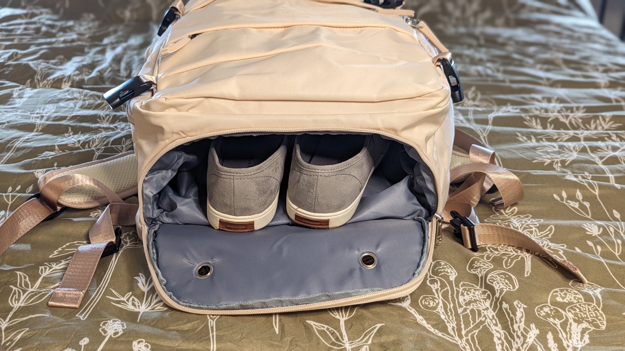 We assessed the livability of this backpack to be perfectly adequate for the non-discerning traveler or for someone who only travels occasionally. The Coowoz holds its shape well, unzips, and unfolds relatively flat for easy access to the main compartment. There are plenty of internal pouches and zippered pockets for organizing smaller items as well. The inner material of the bag is quite slippery, so clothes are prone to slide around a bit inside, and there are no internal compression straps to keep items snug and in place if the bag ever gets tossed around. However, this can be somewhat mitigated by tightening the external compression straps. We found the lower shoe pocket, especially when full of shoes, gets in the way and detracts from the livability of this bag.