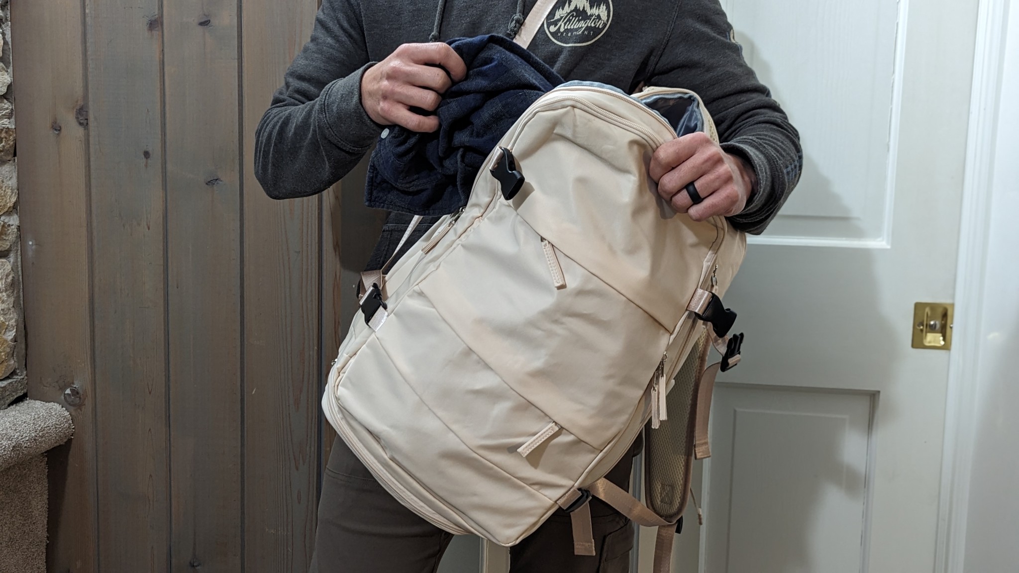 The main compartment of this travel backpack was only able to fit one of the three packing cubes that we used in our standardized capacity tests, which was just about enough room for a set of spare clothes and toiletries. The bottom panel of the backpack provides access to a “hidden pouch” that we like for storing shoes or wet items separate from your clean clothes. That said, this pouch takes up space from the main compartment, reducing the capacity of the main pocket and limiting its usefulness for extra gear.