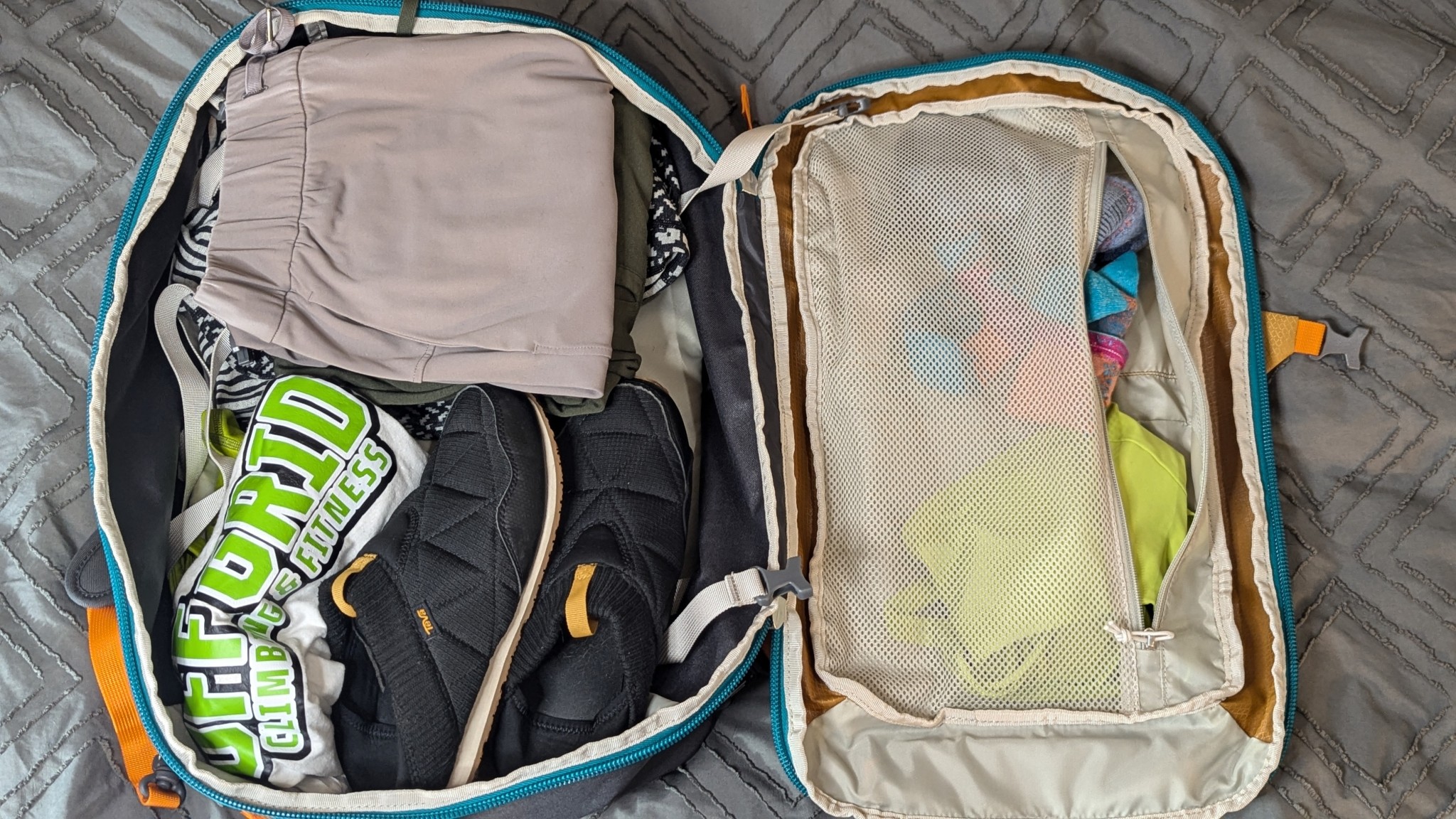 When it comes to living out of the bag, there are pros and cons. We loved that the back panel fully unzips on three sides, letting it fold open like a suitcase. We also loved the large main compartment and mesh organization pocket that provided quick access to everything you packed. That said, with the thinner material, the bag tends to collapse a bit when you're rooting around, making it difficult to retrieve an item without making a mess of everything. On the bright side, this can help reduce the storage space the bag will take up when not in use.