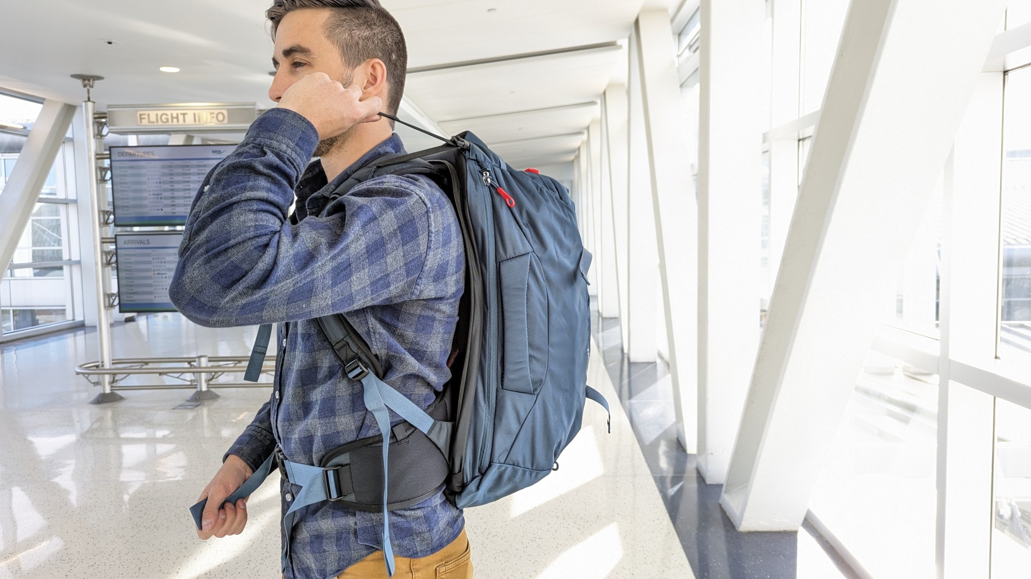 The entire bag-to-human interface of the Farpoint — i.e., the back panel and straps — is incredibly well designed. If you've ever used a dedicated hiking backpack, this is much more comparable to that type of experience than the backpack you used in middle school. The shoulder attachment points are fully adjustable along a sliding track, providing up to four inches of customizable height to fit your torso better. A four-millimeter LightWire frame helps to transfer the load from the shoulder straps to your waist, where there is a comfortably padded hip belt. We especially like that the hip belt adjustability features reverse-grip strap pulls. Instead of pulling the right strap right and the left strap left, you tighten the belt by pulling across your body. We found this to be much more ergonomic.