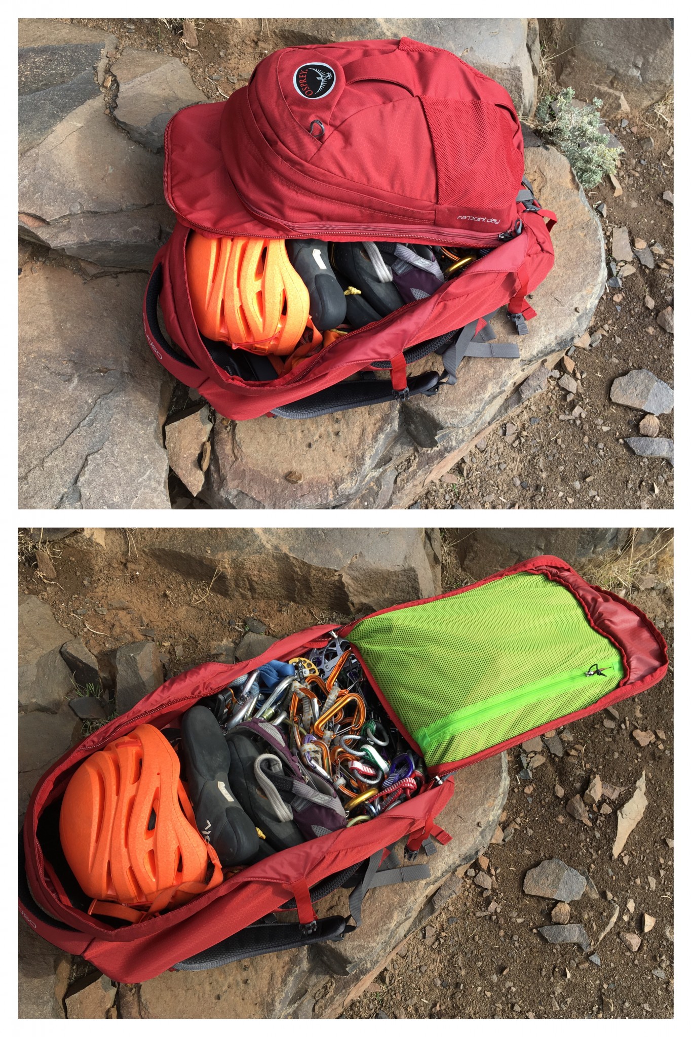 Osprey addressed this exact issue with the Ozone Duplex 60, which has a carry-on-sized “duffel” that attaches to the smaller day pack. Separate the two, and you have your carry-on and your personal item! Putting the larger compartment on the outside may seem nonsensical, but we found that this part was best for clothing and puffier, lighter-weight items, so it didn't make the bag feel too unwieldy or unbalanced. Clever!