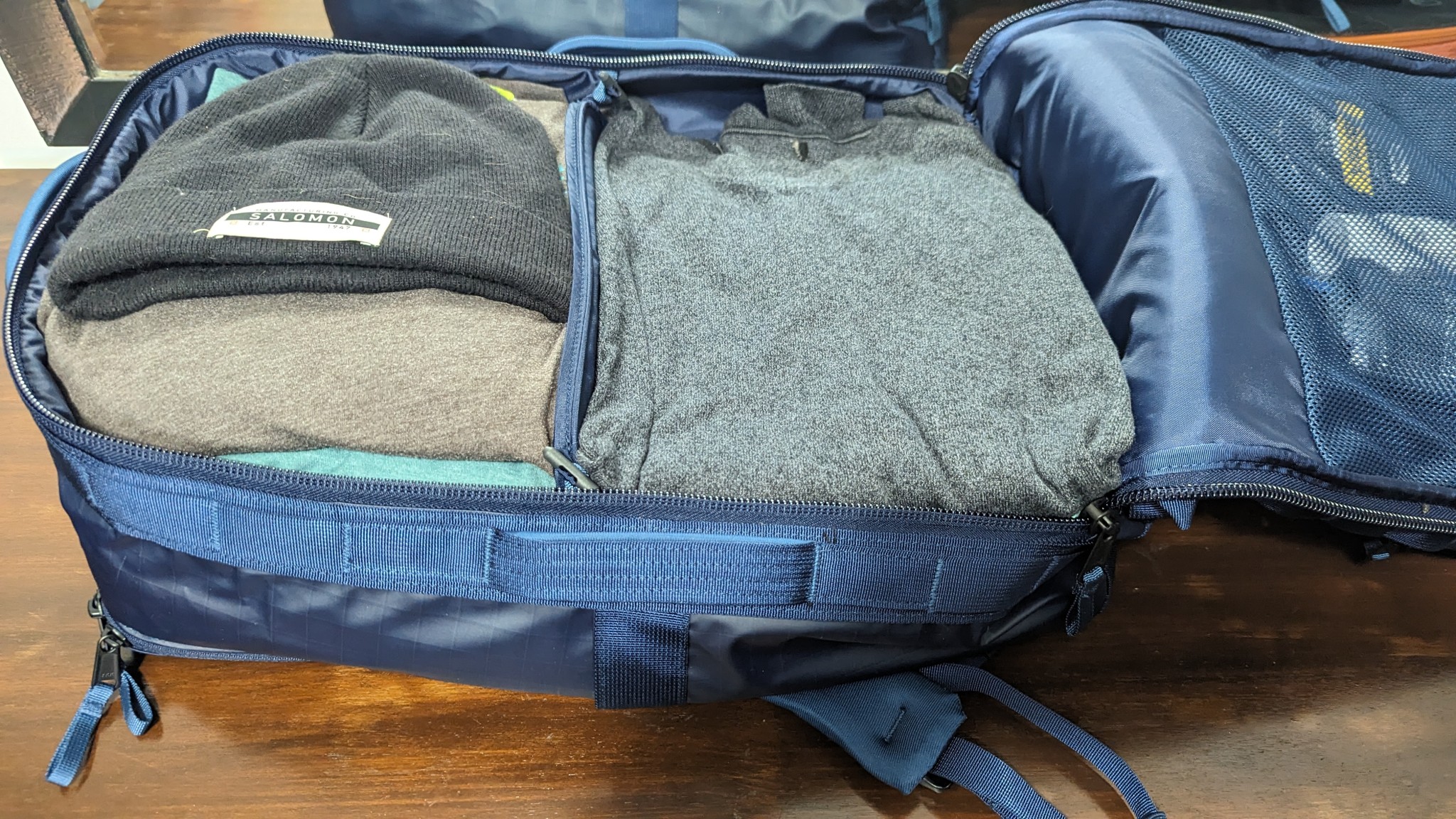 It's really easy to live out of this bag. The main compartment has a collapsible center divider that segments the compartment into two separate spaces perfectly sized to accommodate a short stack of folded clothes in each one. We loved that we could easily search through the clothes on the bottom without disturbing what was on top. The mesh pocket found on the inside of the main flap was great for stowing smaller items such as socks or toiletries.