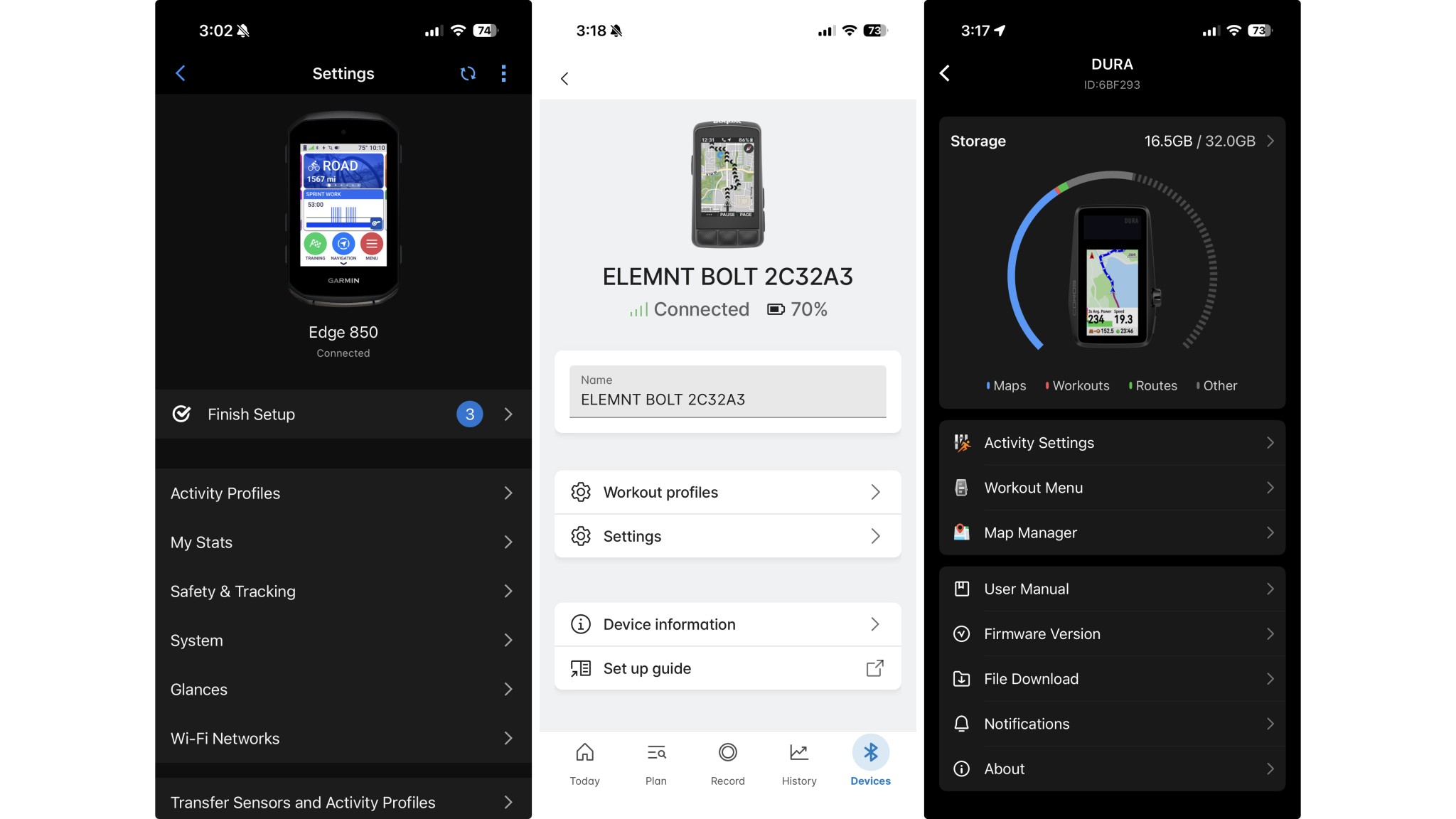 Here you can see the device control page from the respective Garmin, Wahoo, and Coros apps. All three are really solid, although Wahoo makes controlling the ELEMNT Bolt V3 extremely easy in comparision. Credit: Nathaniel Bailey