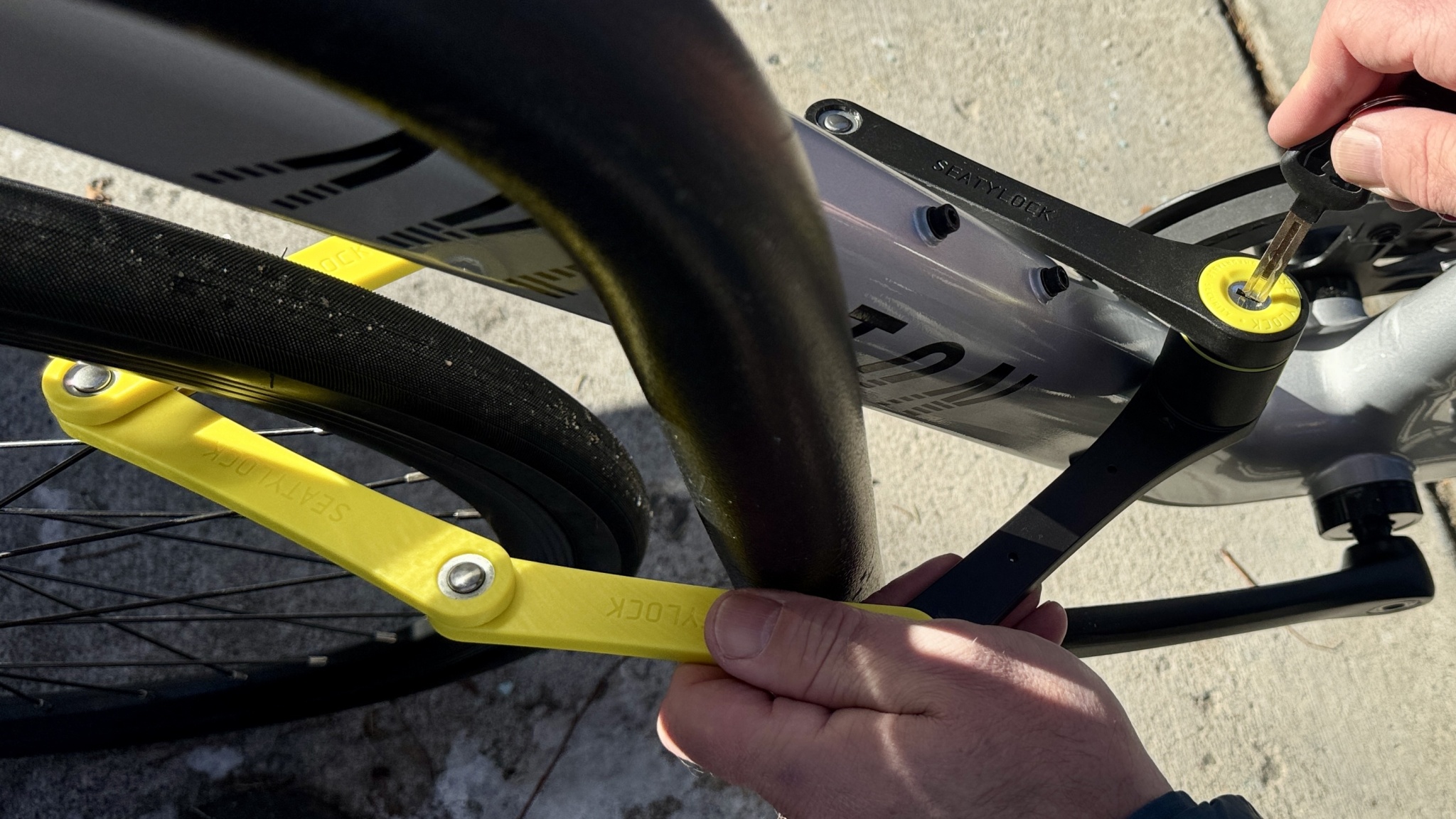 To evaluate versatility, we tested how much of a bike each lock could secure. Some models only accommodate the frame and one wheel, while others can secure the saddle, both wheels, and the frame to a fixed structure. We removed the front wheel and positioned it alongside the rear wheel to test whether both could be locked together. We also tested across different bike types and sizes—from slender road bikes with narrow tires to sturdy mountain bike frames (yes, we've tested many!) with wide tires. Locks that secured more bike components scored higher. Additionally, we evaluated how well each lock worked for securing other valuables like dirt bikes, motorcycles, bike cargo trailers, and equipment stored in garages or sheds.