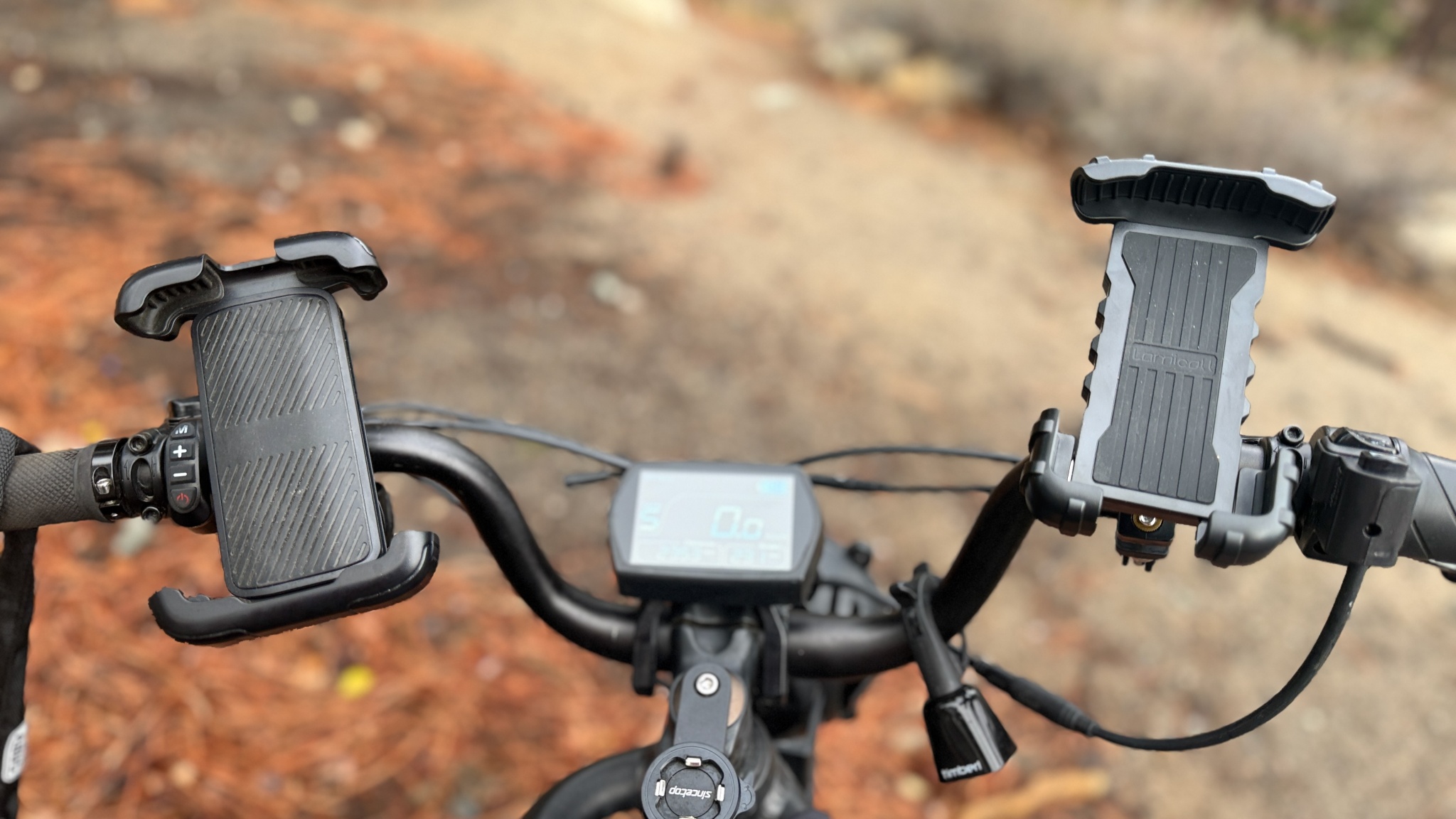 The Lisen (left) and the Lamicall (right) in a handlebar shootout. Both are great, but we prefer the Lisen attachment to the bars. Credit: Chris McNamara