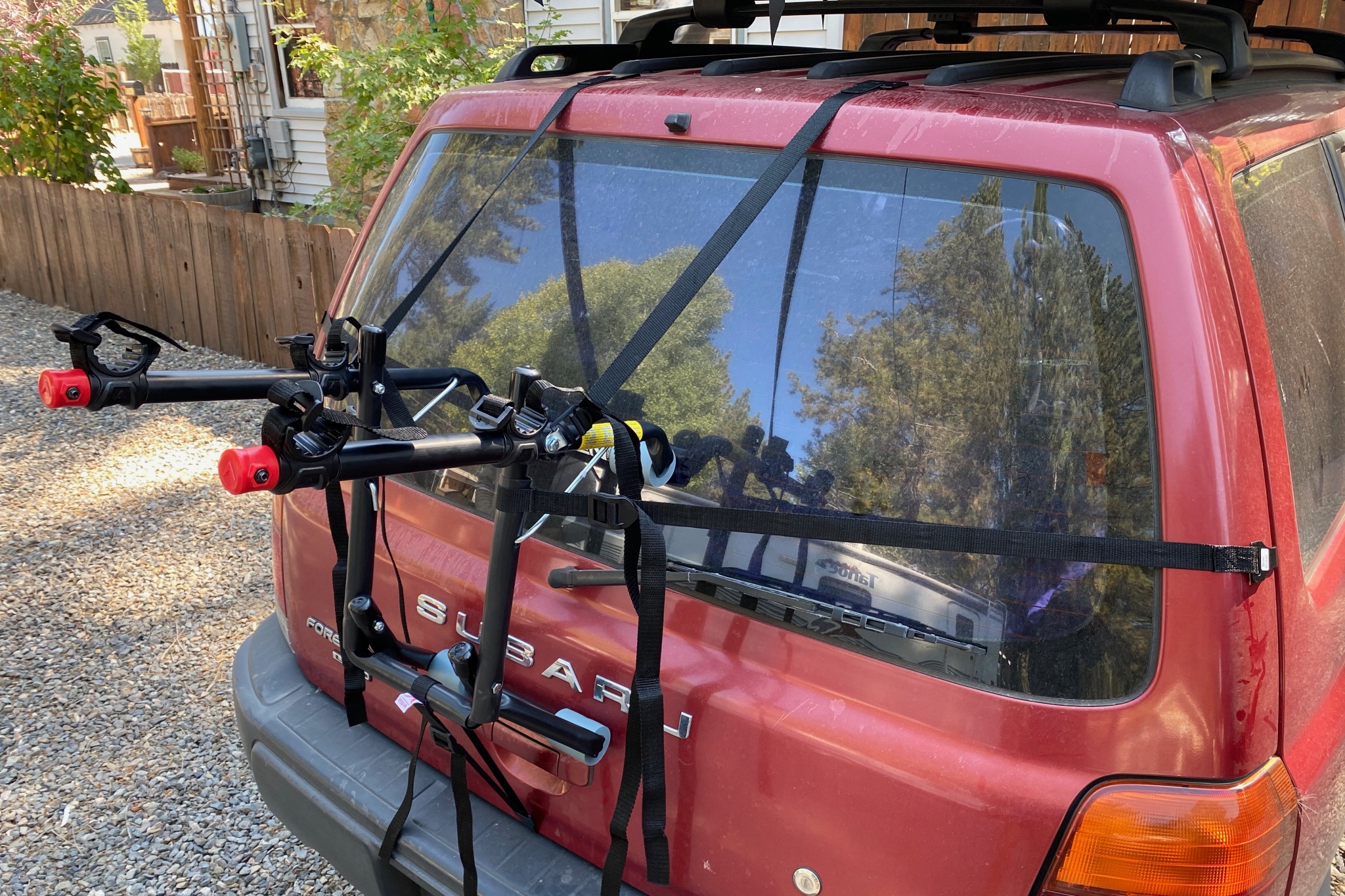 This rack is quite easy to attach to and remove from the vehicle with 5 straps that hook into the top, sides, and bottom of the trunk or rear hatch of the vehicle. Credit: Jeremy Benson