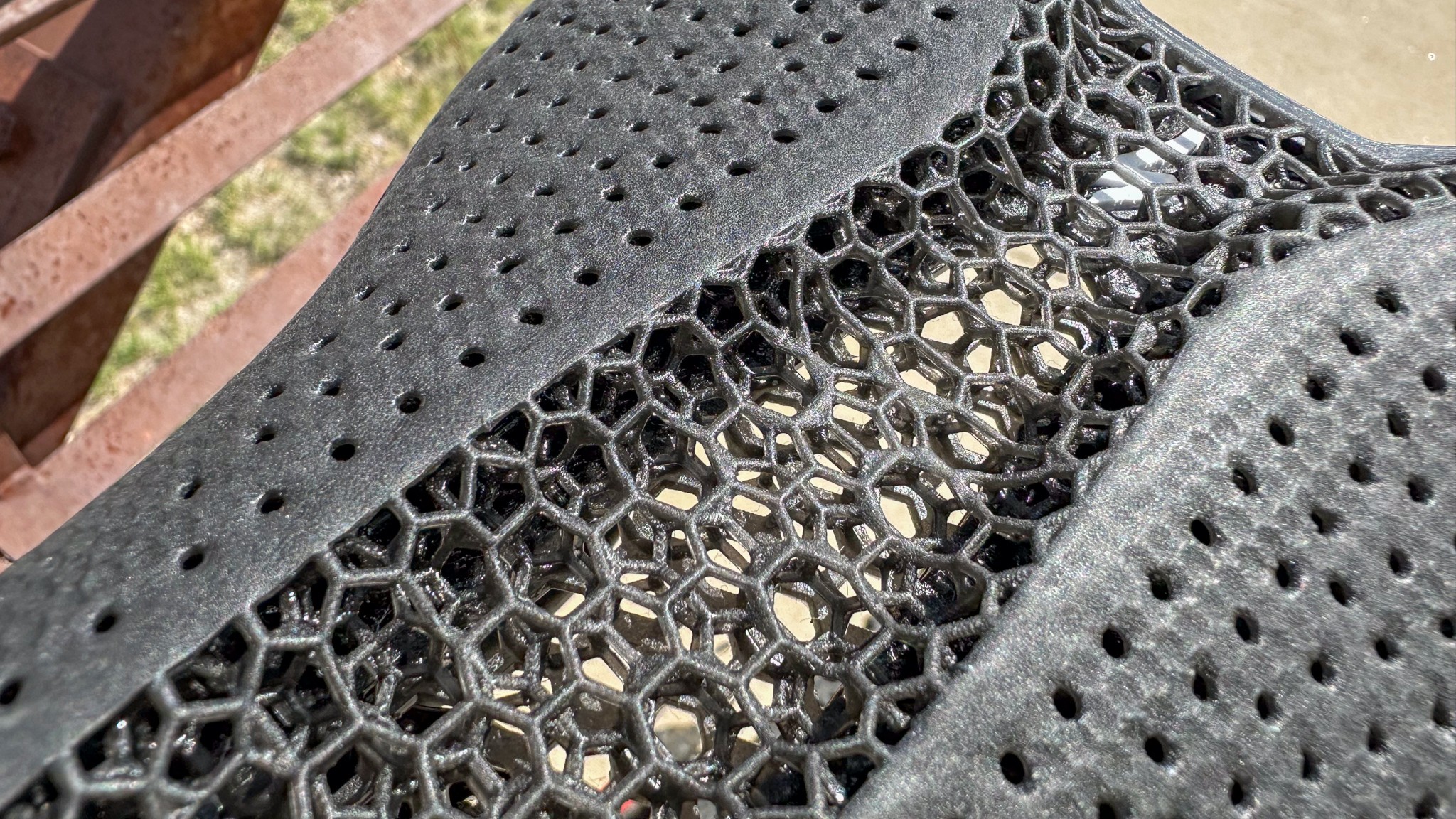 The complex, 3D printed top padding of the Specialized S-Works Romin Evo with Mirror weave a complex matrix of nodes to keep your butt supported in all the right places. Credit: Justin Simoni