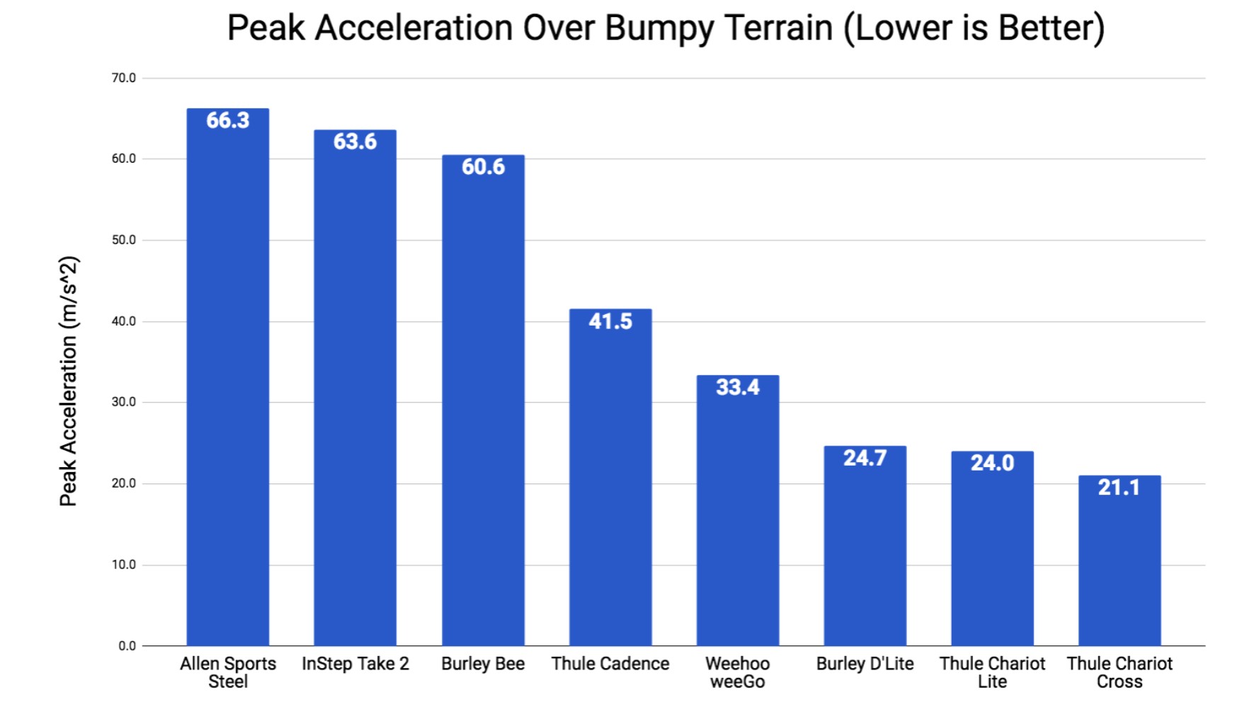 We mounted an iPhone with an accelerometer app to the test dummy to measure suspension performance, then towed the trailers over several prominent bumps at identical speeds. The primary purpose of this trial was to obtain numerical results to complement our visual test. The test also demonstrates how jostling in a bike trailer has the potential to affect 6 to 9 month old children, who may not have the strength to resist what most bikers would consider unimpressive bumps. Again, we do not recommend towing a child younger than 12 months in a trailer.