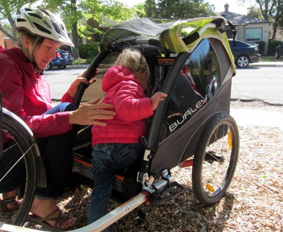 Trailer testing is a rough job, but somebody has to do it. Here, our passenger tester is stoked to go for a ride in the Burley Bee.