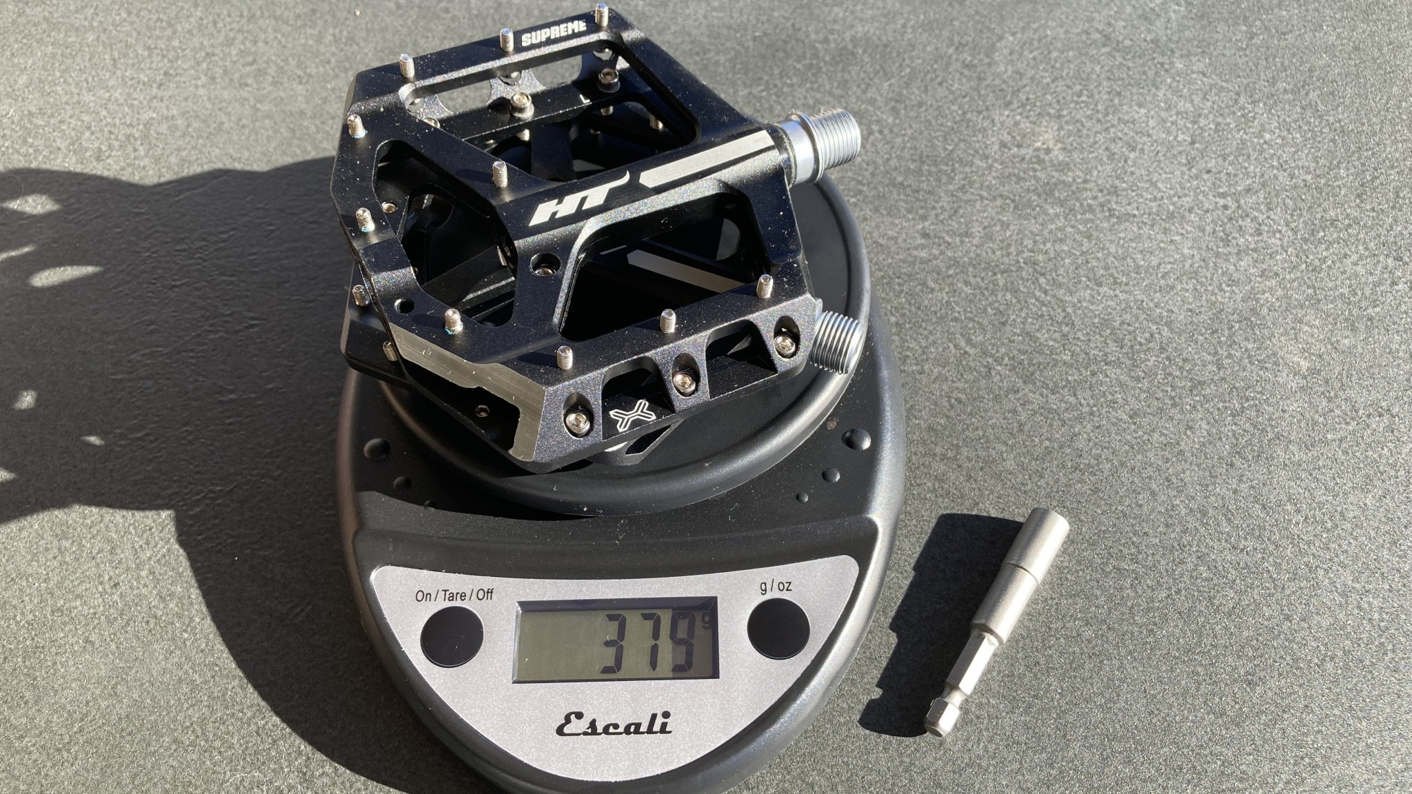 Each set of pedals is measured on a kitchen scale, and their weight is recorded. Frequently, there are small differences from manufacturers listed weights. Credit: Tara Reddinger-Adams