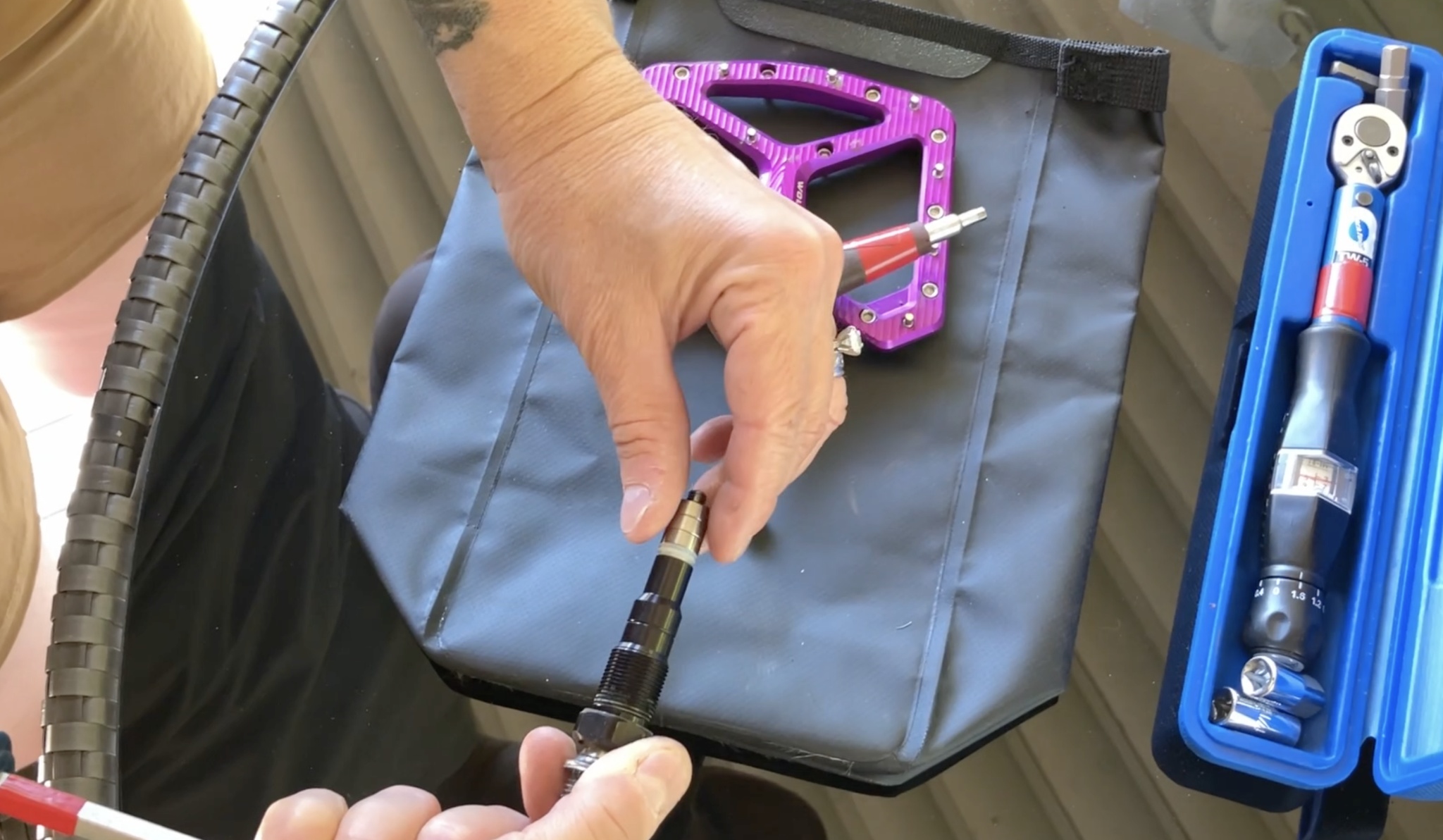 We do a basic spin test on each pedal to see how well it spins on its axle and the amount of drag the bearings have. Credit: Tara Reddinger-Adams