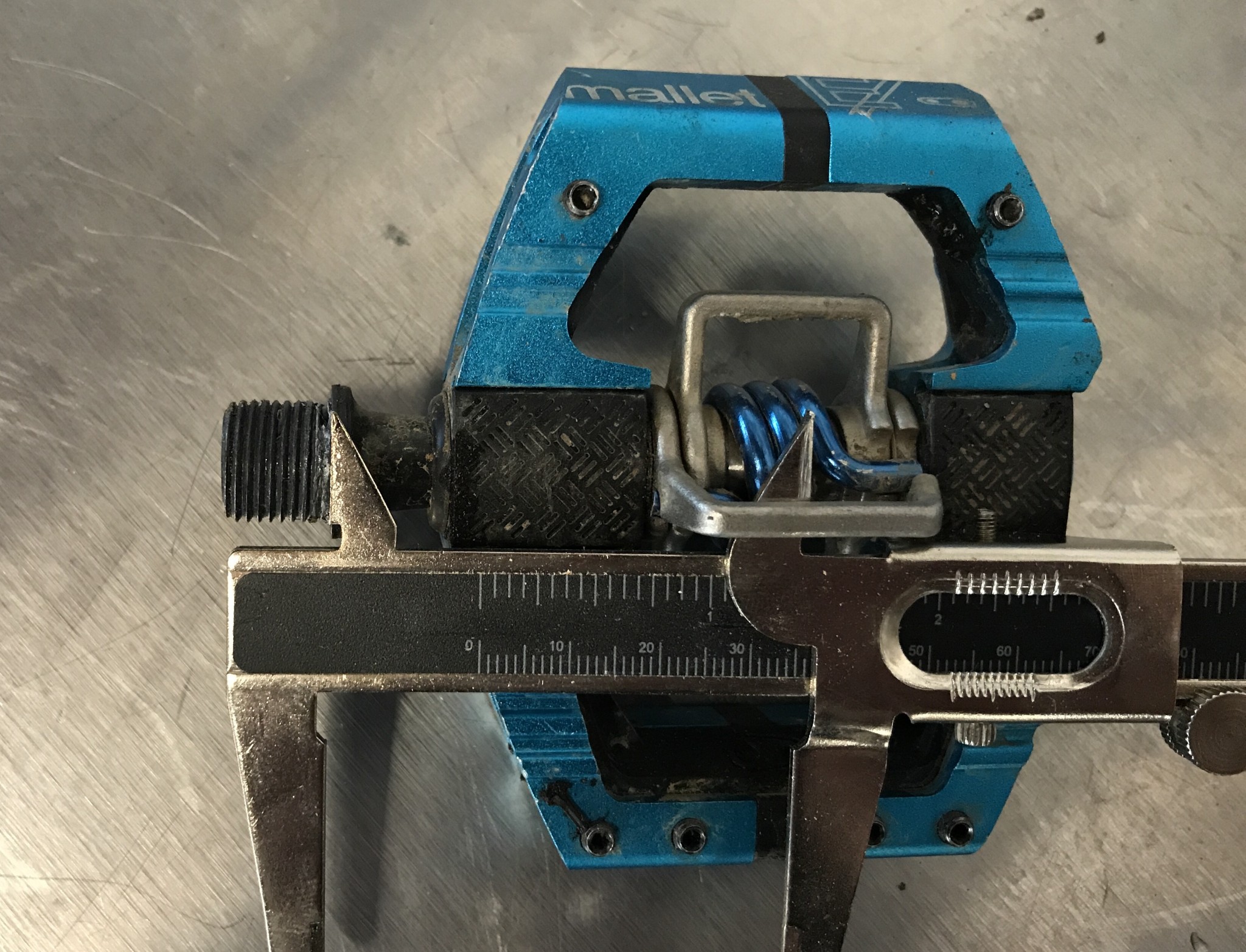 We measure each pedal's cage dimensions using a digital caliper. We measure the profile height from base to base directly over the pedal spindle. We also measured the pedal's effect on Q-factor, using a caliper, which is the distance between the flange of the spindle where it meets the crank arm and the center of the engagement mechanism. This dictates how wide your stance will be and, in some cases, how likely you are to strike the pedal on a trail-side obstacle.