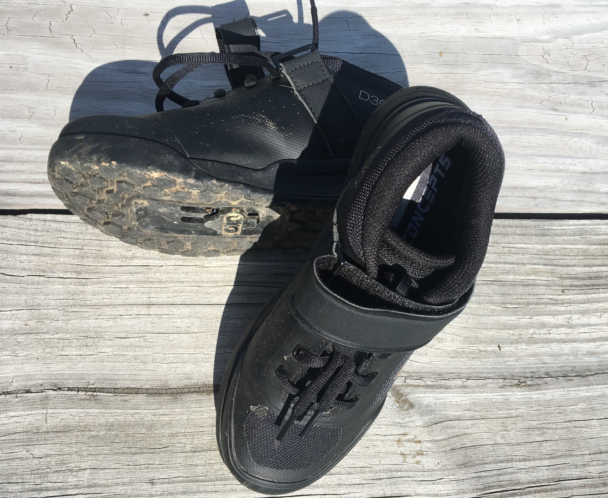 Many shoes in our metric perform very well in this metric, thanks to grippy outsoles and good flex in the midfoot. The Ride Concepts Hellion Clip uses Clip Grip rubber in a uniform hexagonal pattern on the sole. This rubber compound is harder than the compounds found on their flat pedal shoes, but still has an exceptional grip for hiking and great flex at the midfoot for a comfortable gait. Crankbrothers uses their Match Compound rubber on the soles of their Mallet Boa Clip shoes with directional lugs for maximum traction off the bike.