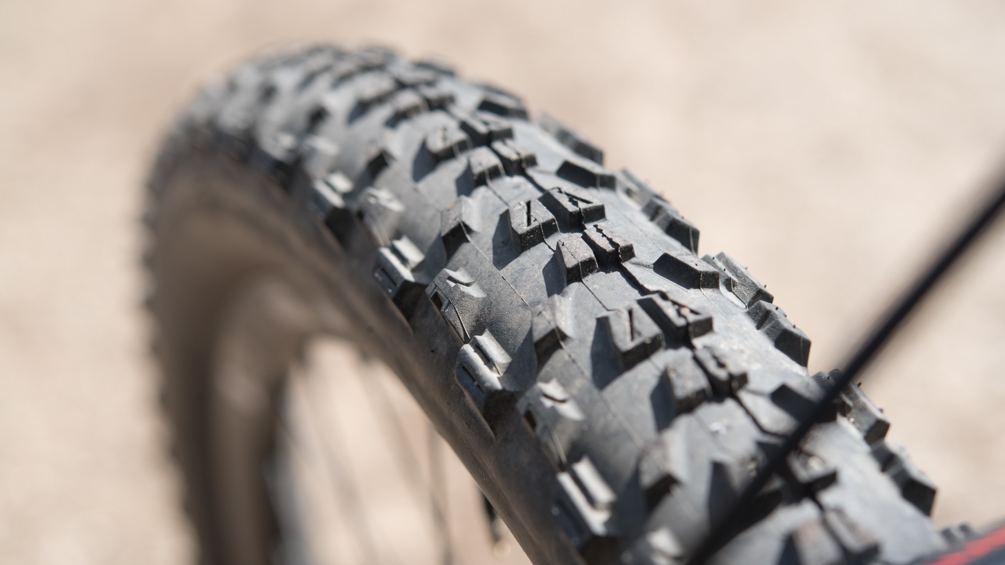 With rear tires, you'll find huge variances in traction, depending on the type of terrain and the surface conditions. If the mission of the day is to climb up a ridiculously loose fire road with golf ball-sized rocks loosely embedded in the surface and soil that is so loose you're leaving a wake in the sand behind you, something knobby like the Minion DHR II will “get 'er done.